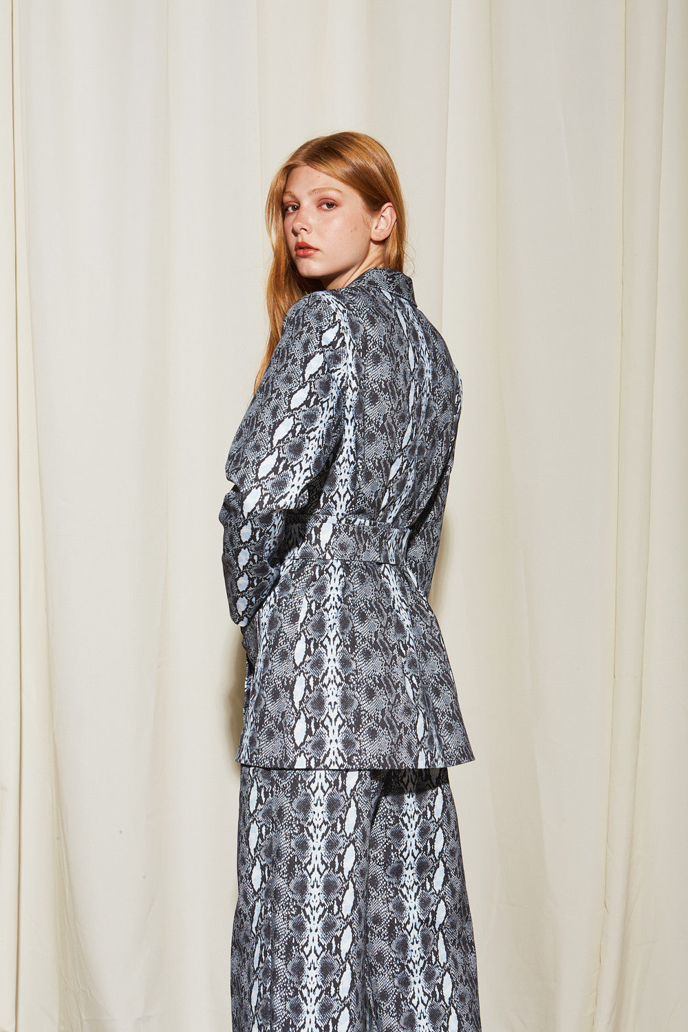 - Color & Pattern: Muted gray base with a snake/reptile print in white, black, and gray