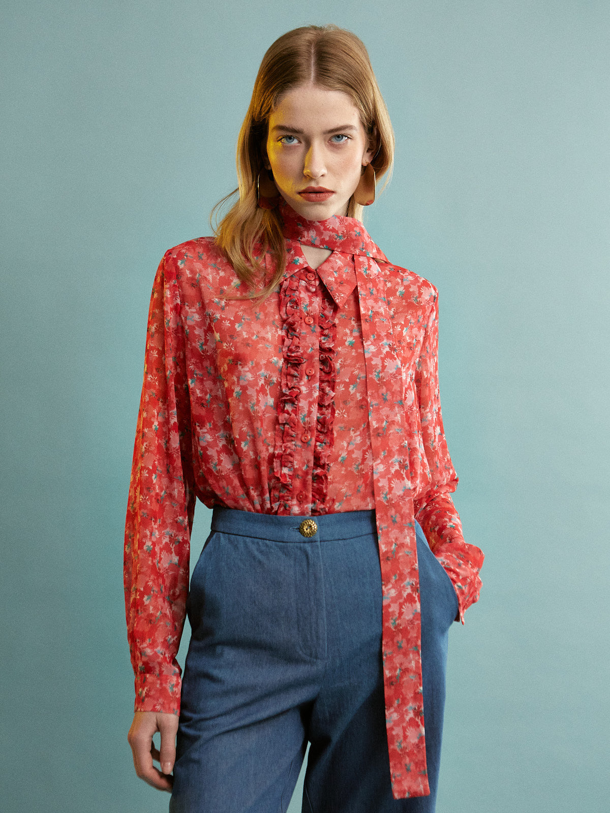 - Design features: Collared V-neck with button-front closure, long sleeves, straight hemline with a flared silhouette, belted waist, and structured seams