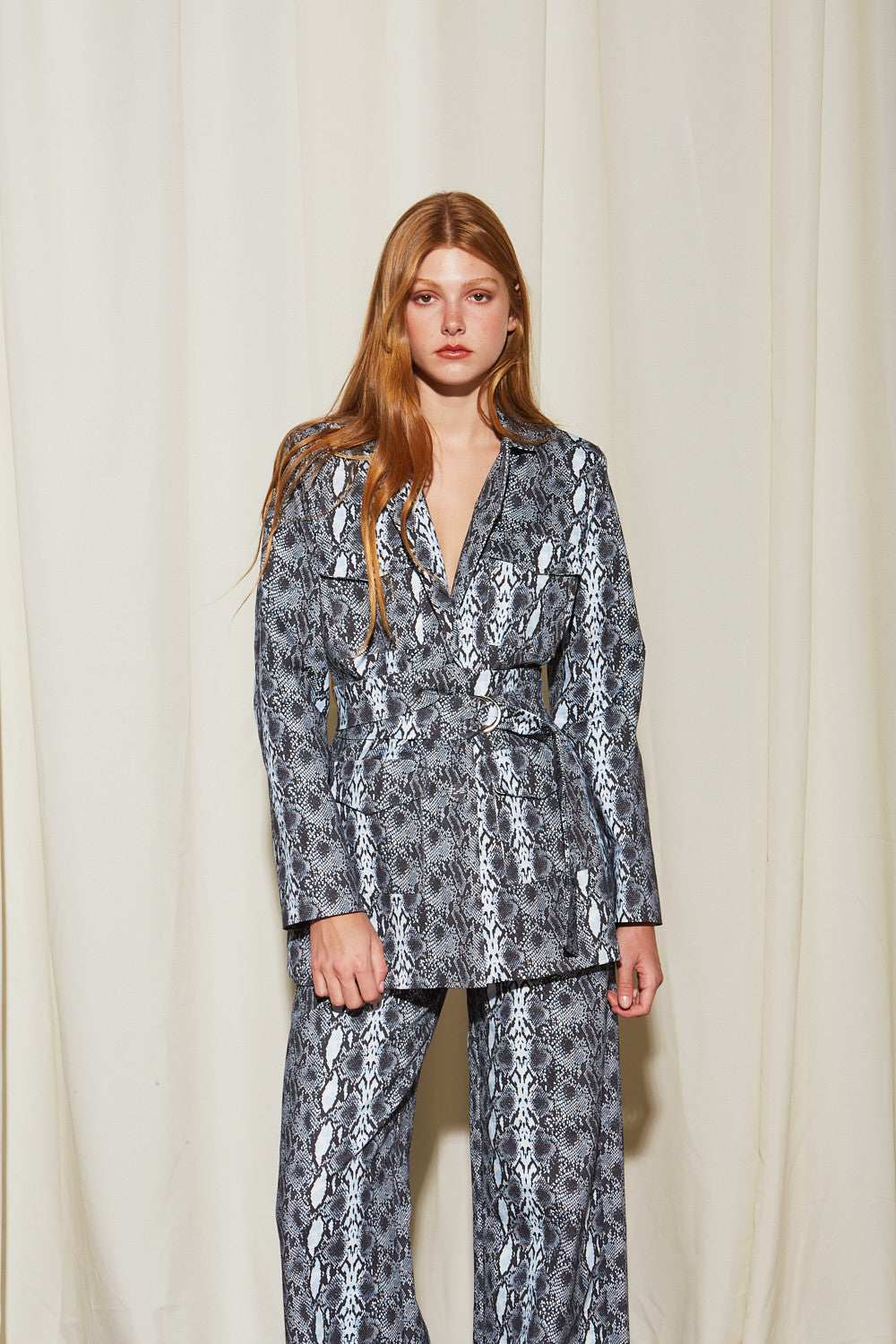 Make a statement with this maxi-length dress featuring a muted gray base adorned with a snake/reptile print in white, black, and gray. The tailored, modern formal style combines a collared V-neck and long sleeves with a belted waist and wide-leg flare, creating an edgy and sophisticated look.