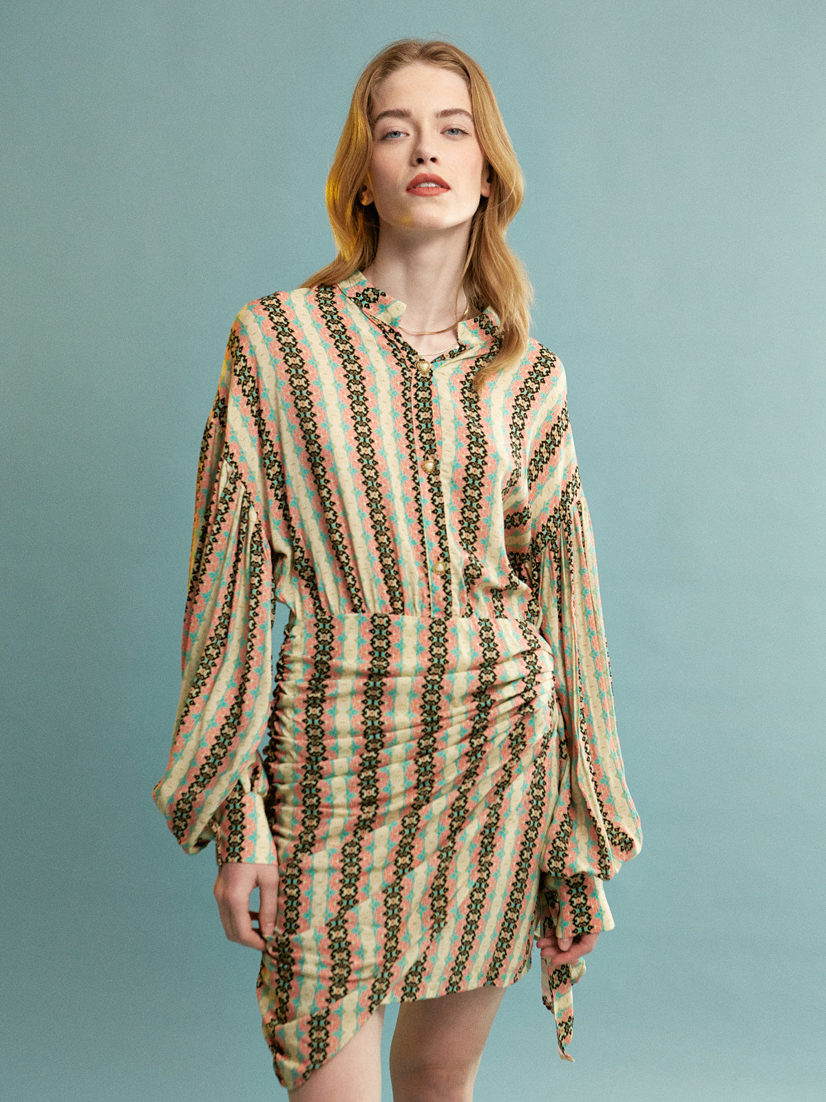 Step into a world of bohemian charm with this mini dress. It showcases a captivating geometric print in warm tones of peach, coral, yellow, and greenish hues, accented with a dark shade of black or deep brown. The long, voluminous puffed sleeves and ruched details add a touch of retro flair.