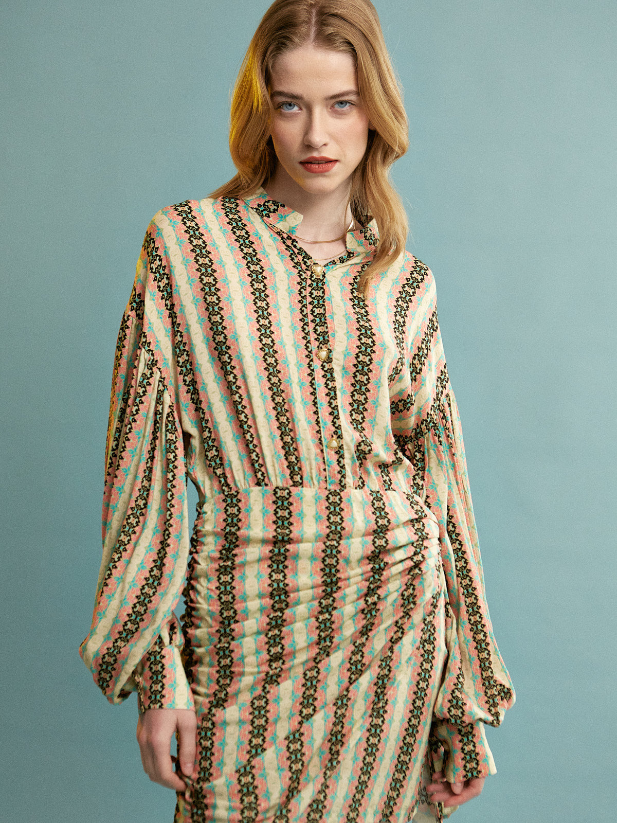 • Design features: High neckline, long voluminous puffed sleeves with fitted cuffs, asymmetric and gathered hemline, ruched detailing along the lower body, and possibly a hidden closure at the neckline or front