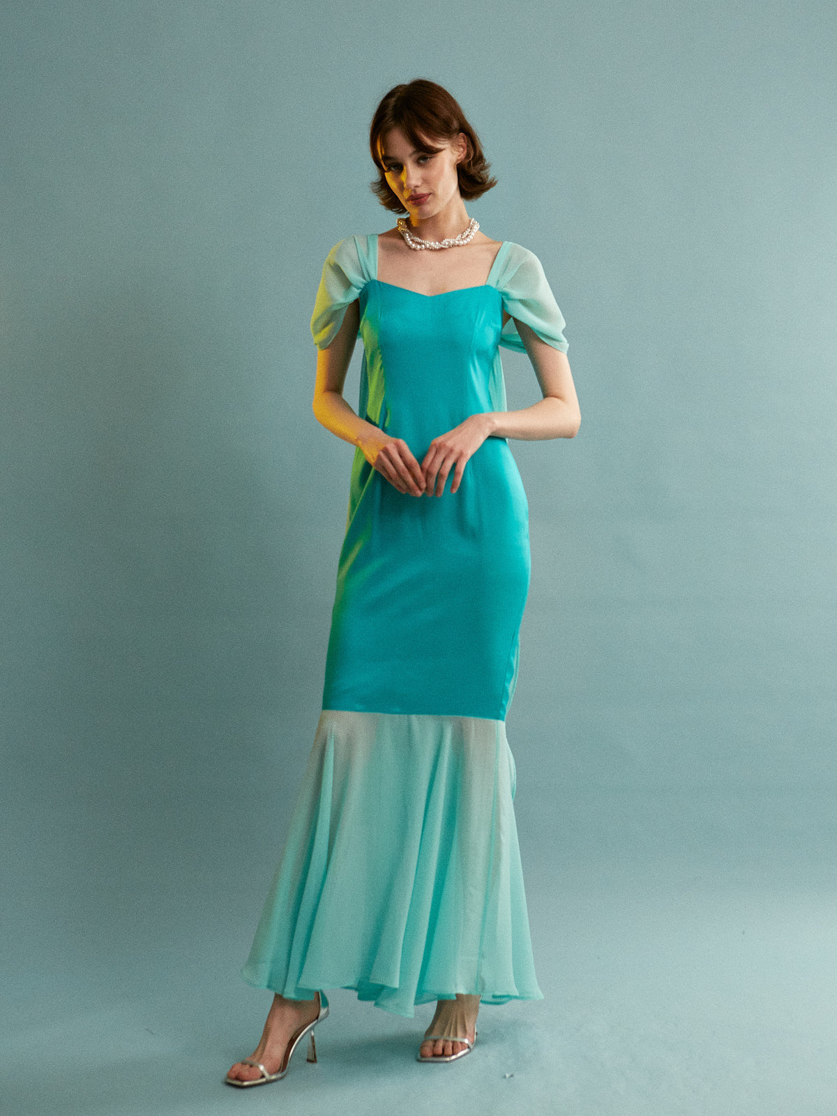 This elegant maxi dress features a striking combination of two solid turquoise shades. The lighter mint – green blouse pairs beautifully with the deeper, saturated turquoise skirt. With its retro – inspired 1970s/1980s aesthetic, it exudes sophistication and vintage charm.
