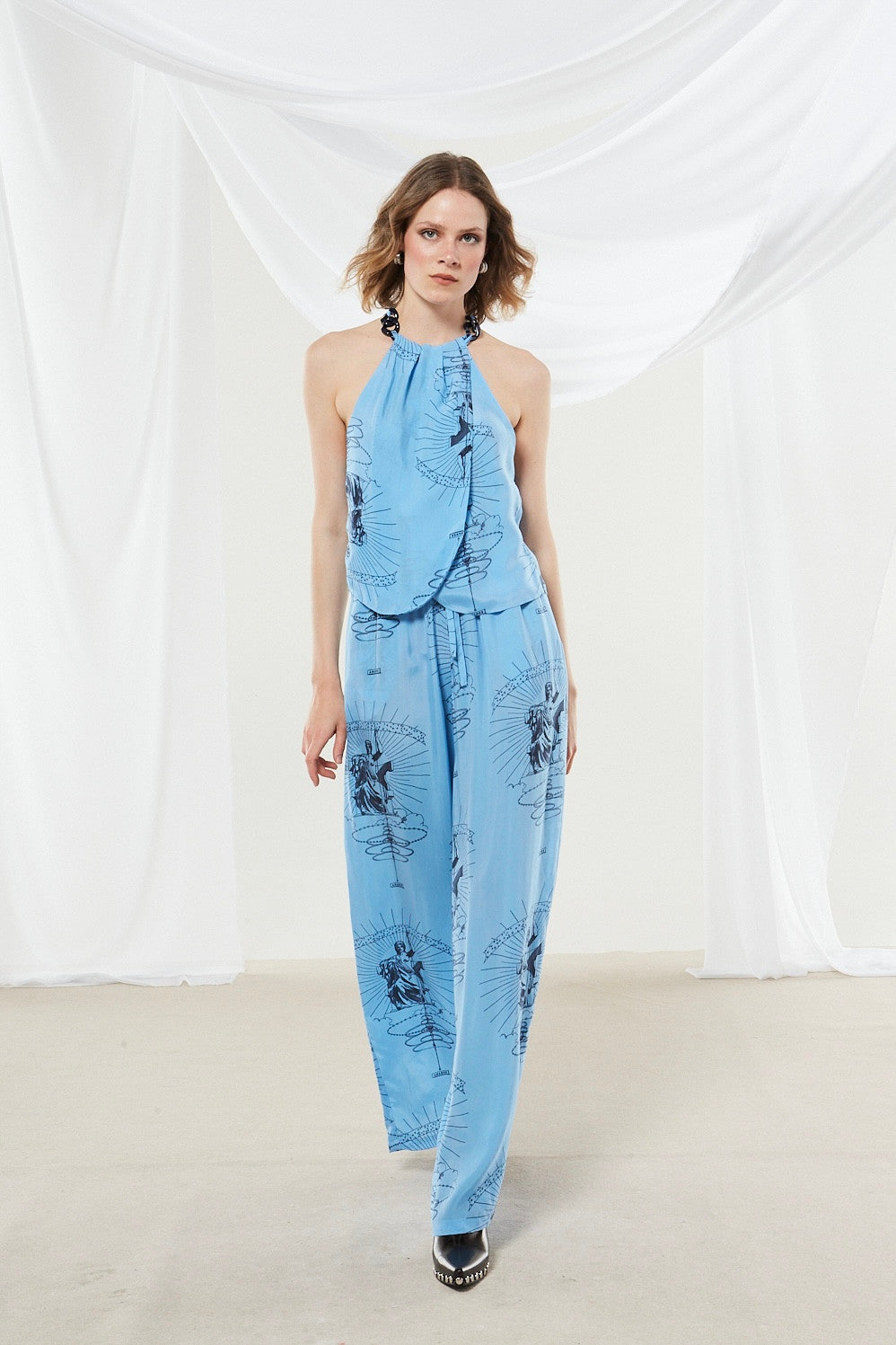 - Design features: High halter neck with a draped, gathered front secured by a black ring or knot detail; sleeveless; top has a tailored, cropped hem, trousers have a wide – leg, straight silhouette with a straight hem; draped front on the halter top, drawstring waist on the trousers.