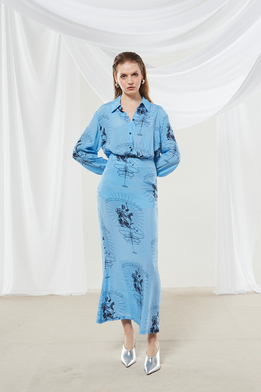 This is a sophisticated two-piece loungewear set in a light pastel blue color. It features a monochrome dark blue graphic print with stylized, classical – inspired figures and radiating lines. The long – sleeved top has a collared neckline and an asymmetric hemline, while the maxi – length wide – leg pants have a straight hemline, creating a chic and artistic look.