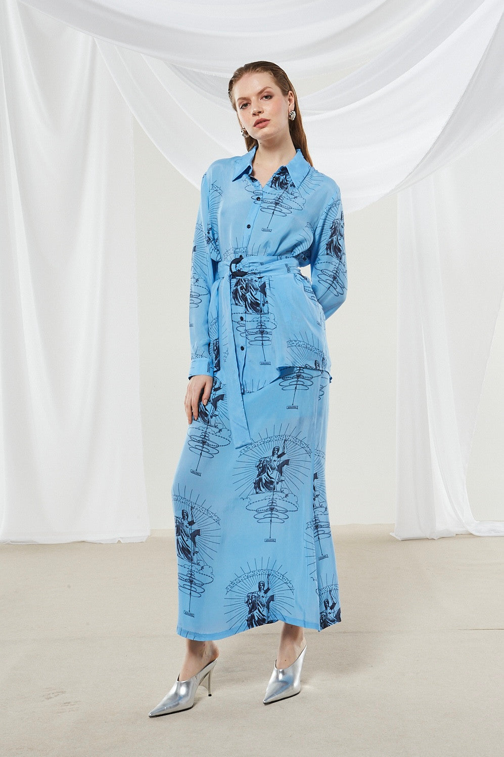 Step into the world of high – fashion with this stunning maxi dress. It features a light blue base adorned with a repeated dark blue or black graphic print of stylized, symbolic figures. The blend of a collared shirt – style bodice and a form – fitting skirt creates a unique and eye – catching look.