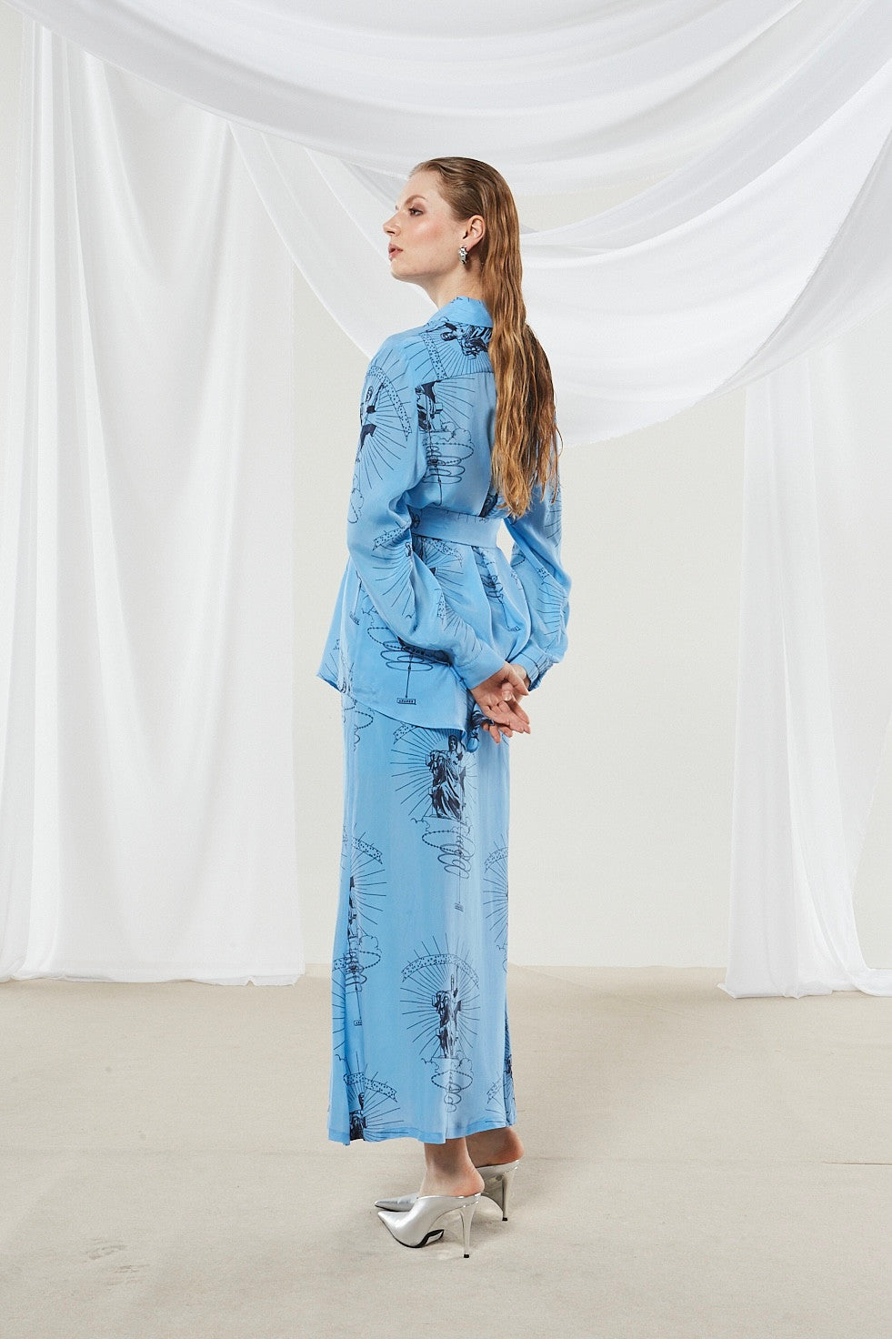 - Color & Pattern: Light blue base with a repeated graphic print in dark blue or black featuring stylized, symbolic figures and radiating lines/text motifs.