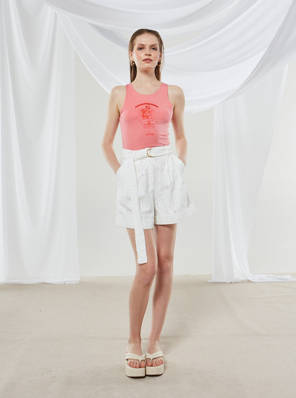 - Color & Pattern: The bodysuit is a solid coral-pink with a red graphic print, while the shorts are a solid white with a subtle textured pattern.