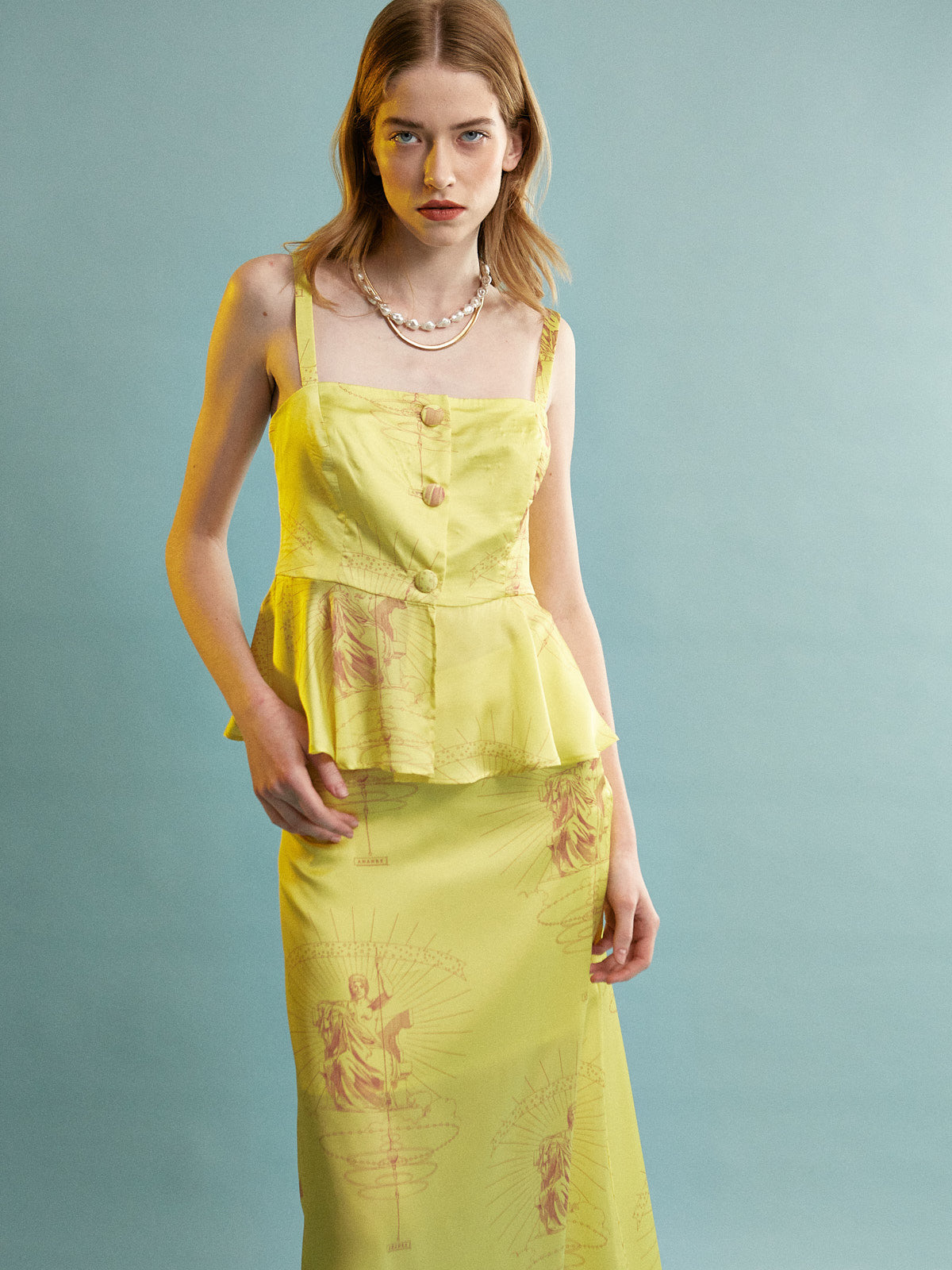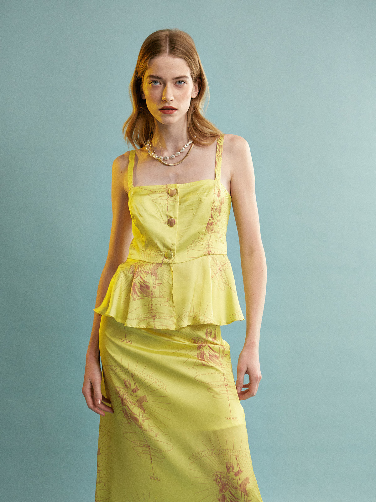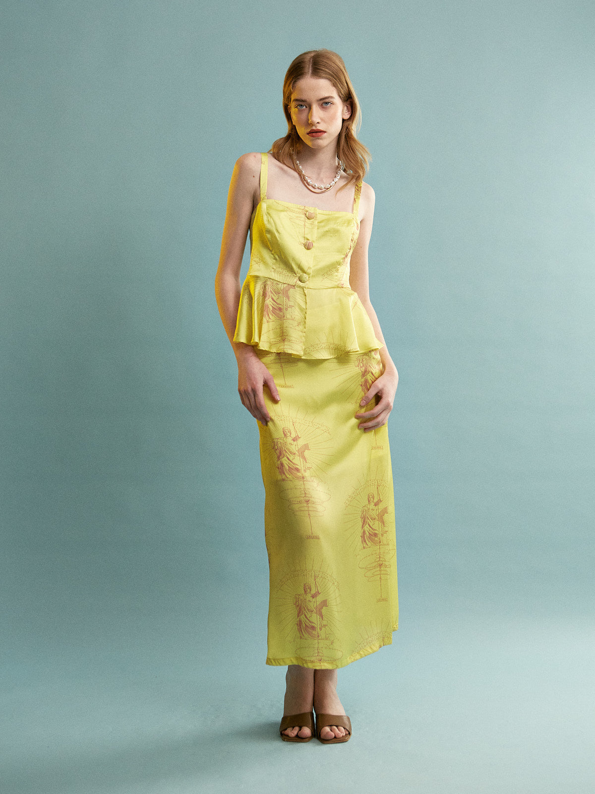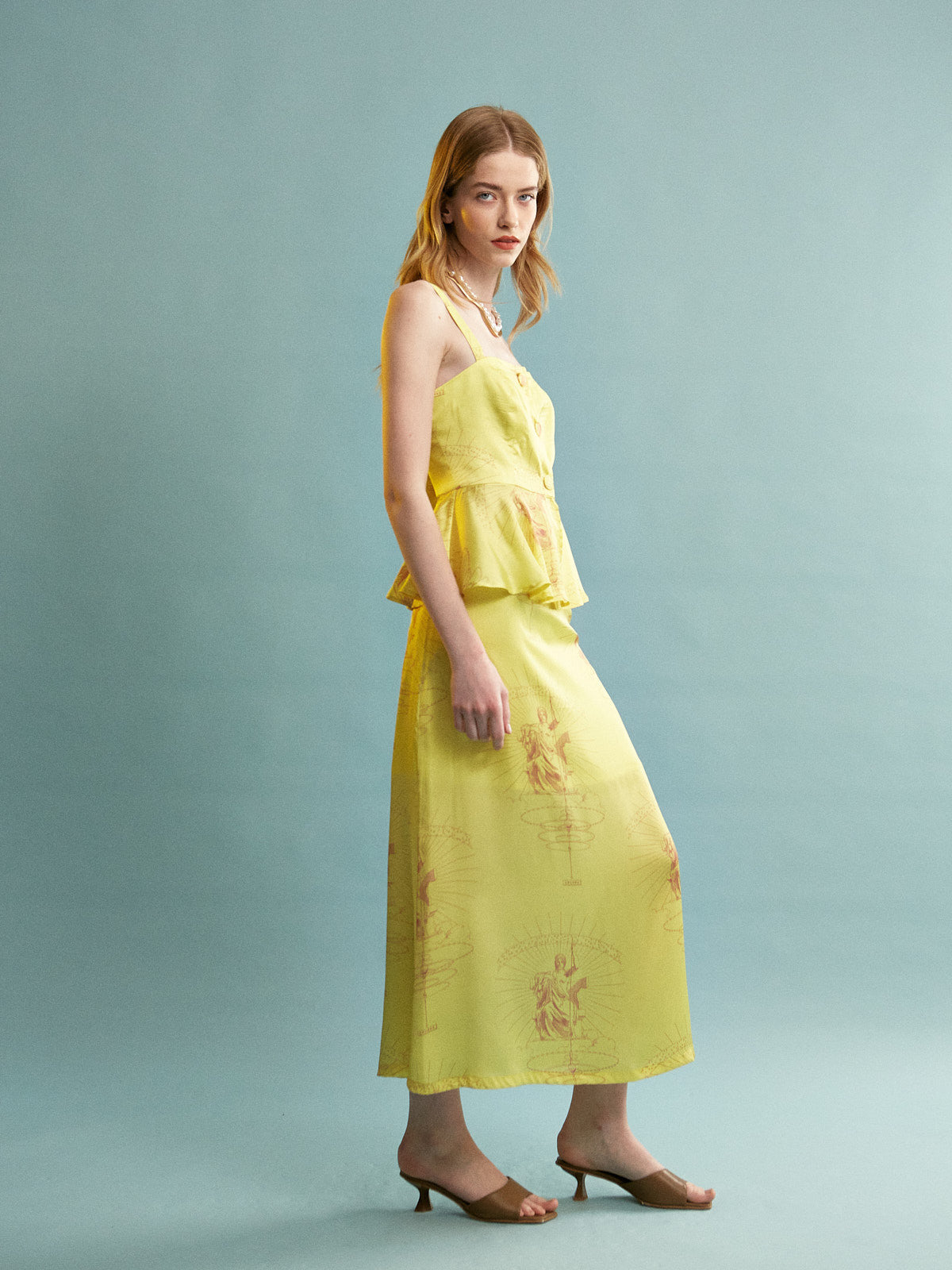 This midi-length dress is a stunning blend of elegance and playfulness. It features a bright lemon-yellow base with an intricate printed pattern of red-brown classical/abstract motifs, resembling vintage art. The structured bodice and straight skirt, along with the peplum detail at the waist, add a touch of retro sophistication.