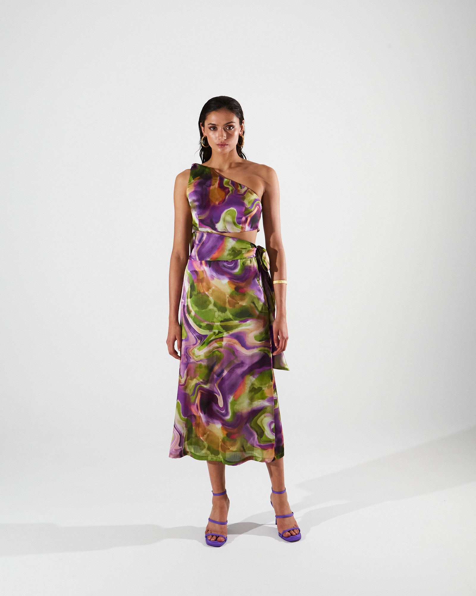 Make a bold statement with this midi dress featuring an abstract marbled print in purple, green, and warm accents of yellow or orange with dark undertones. The one – shoulder design and midriff cutout add a modern and sophisticated touch, perfect for formal events.