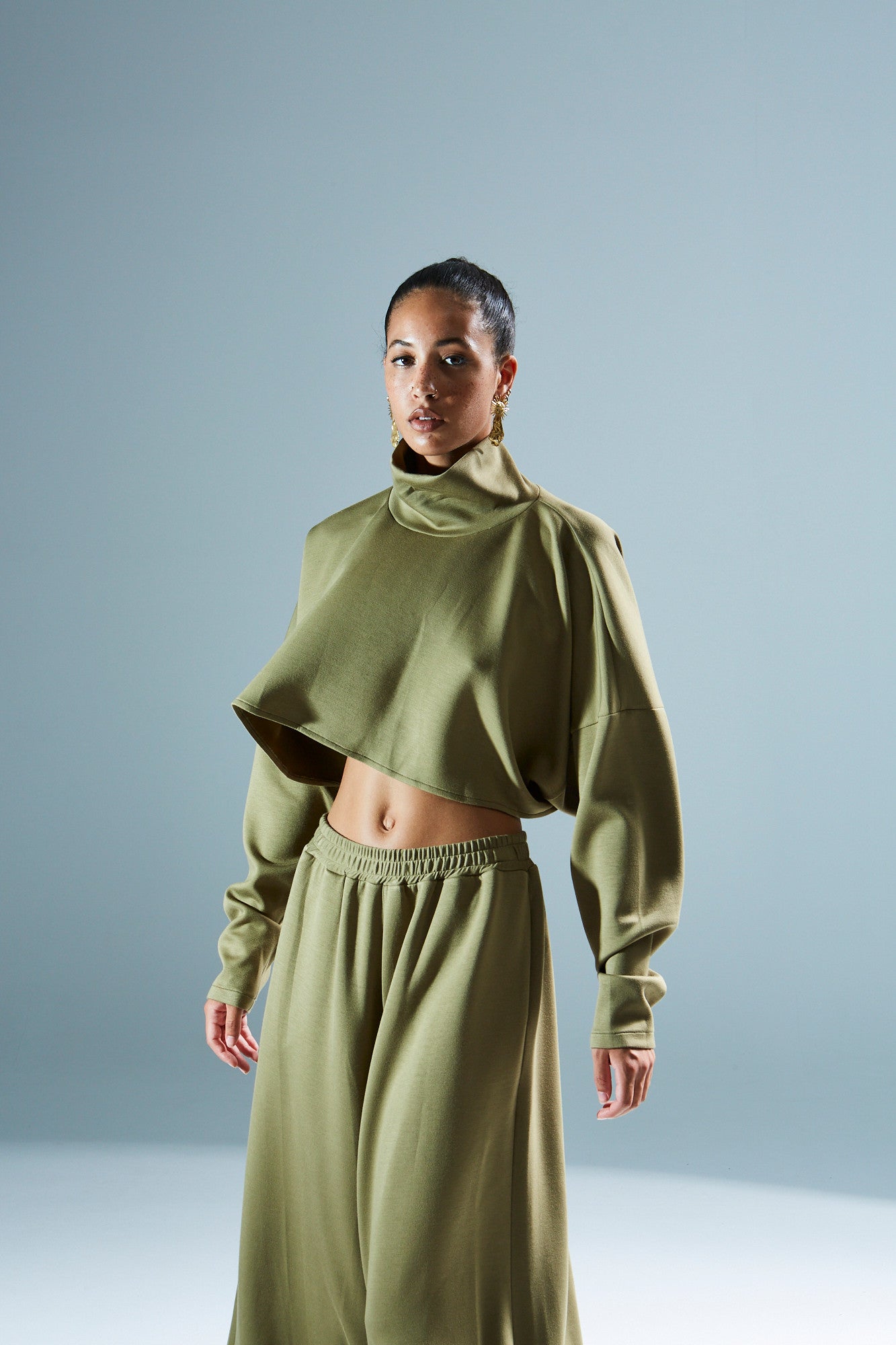- Design features: Round neck, long puffed sleeves, straight skirt with a high front slit, puffed shoulder construction, a small pocket on the left chest, and a structured waist