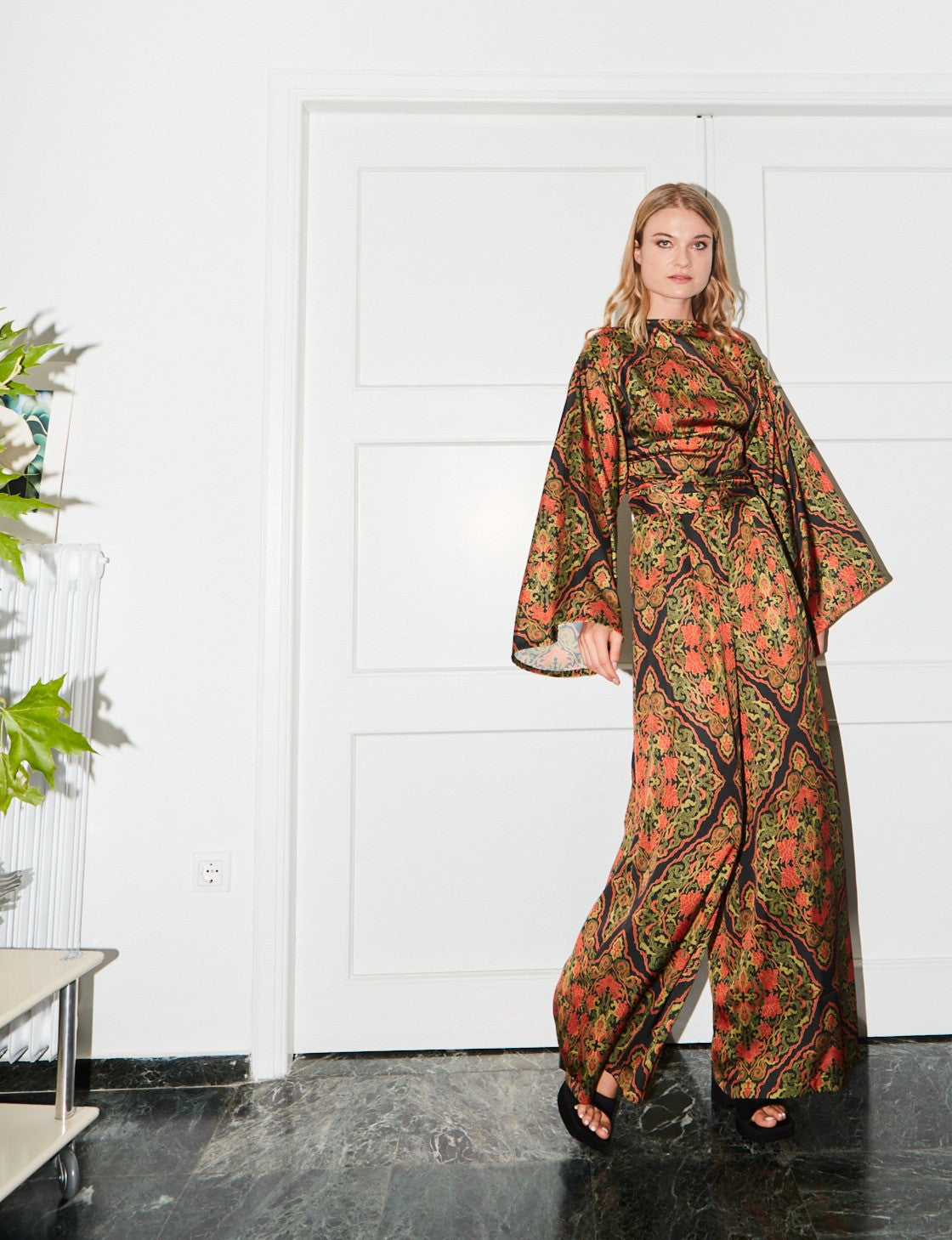 - Design features: The top has a high crew neck and long flared (bell) sleeves with wide cuffs, along with a cropped hem. The pants are high – waisted with a wide, straight – leg hem. There are no visible buttons or zippers, and the set is unified by the matching ornate pattern.