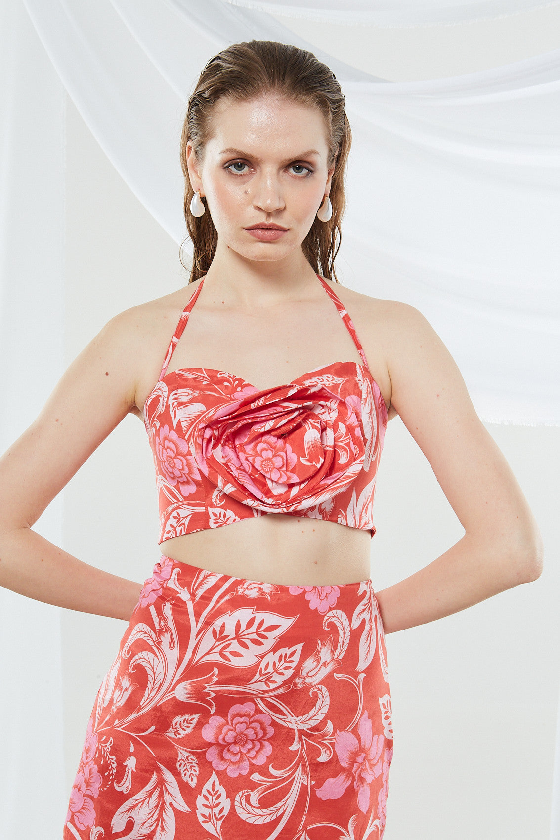 Make a vibrant statement with this mini dress. It showcases a dominant red base adorned with white and pink floral motifs, including swirling leaves and flowers. The halter neck design and midriff cutout add a flirty and feminine touch, perfect for resort or party settings.