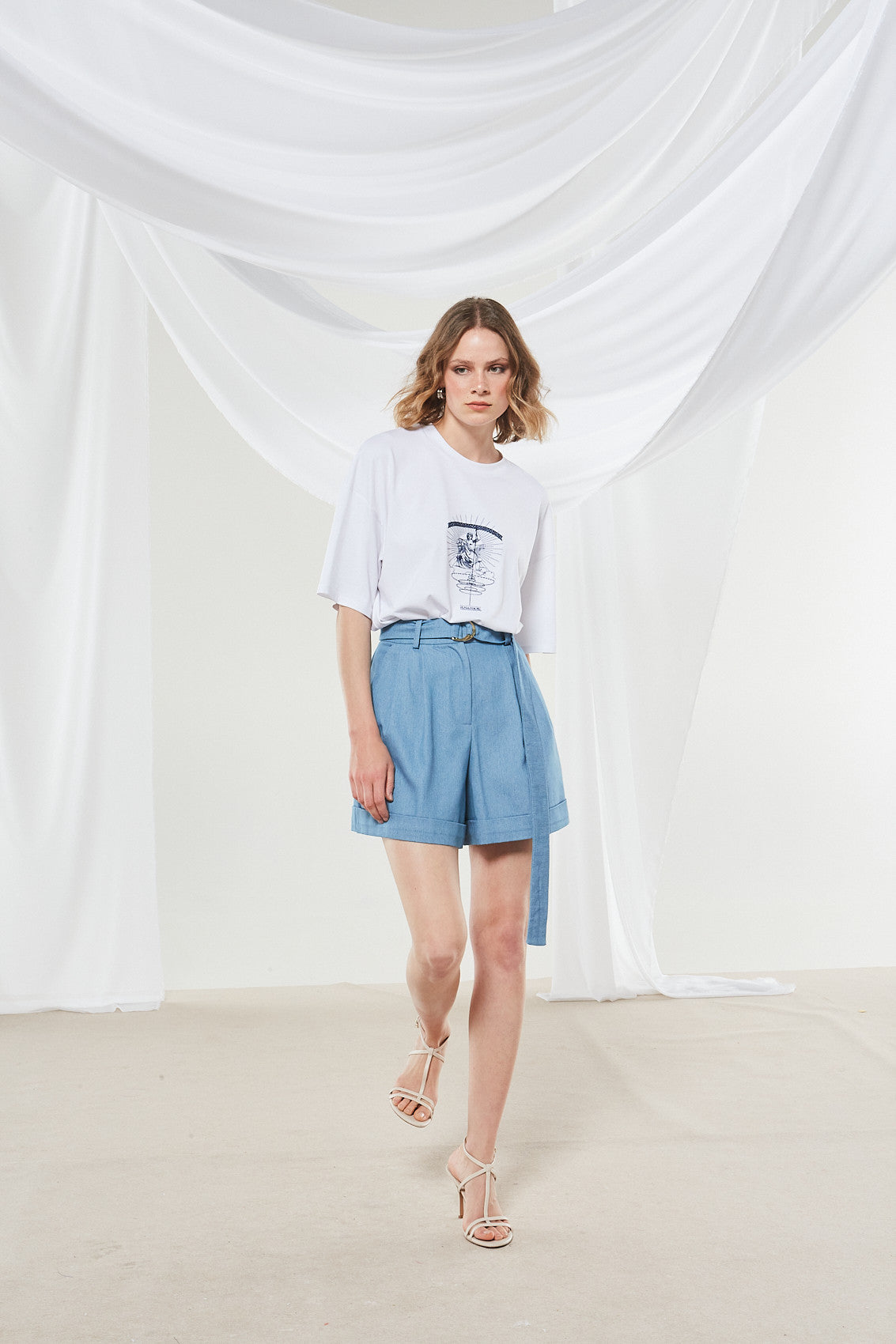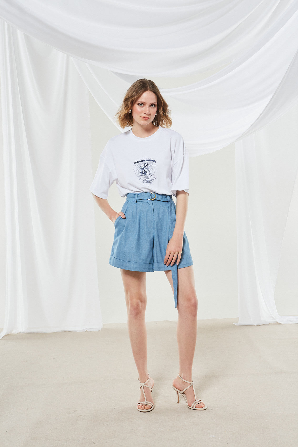 This mini dress, crafted from light blue denim, features a high-waisted design with a belt and gold circular buckle. The front has pleats for added volume, and the straight hemline has cuffed edges. Paired with a white graphic T – shirt, it creates a modern and casual yet polished look.