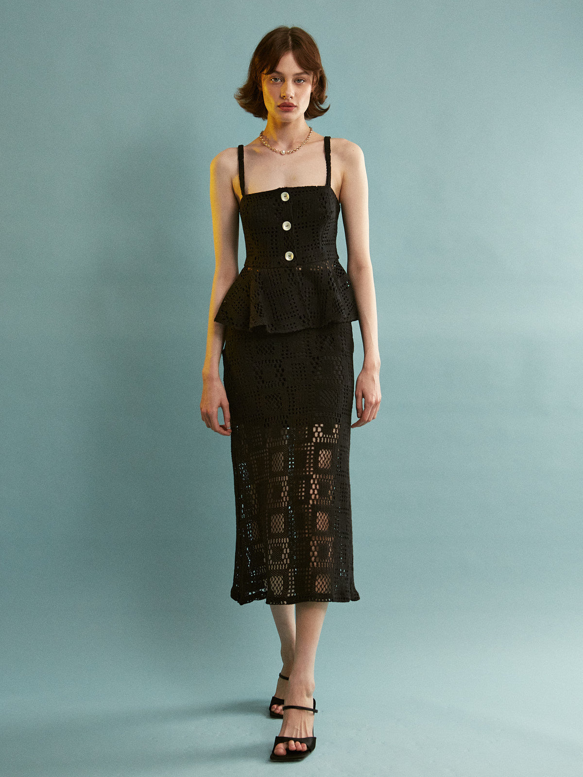 - Design features: Square neckline, sleeveless with thin straps, peplum at the waist, three white round functional buttons on the front of the bodice, and a straight midi-length skirt.