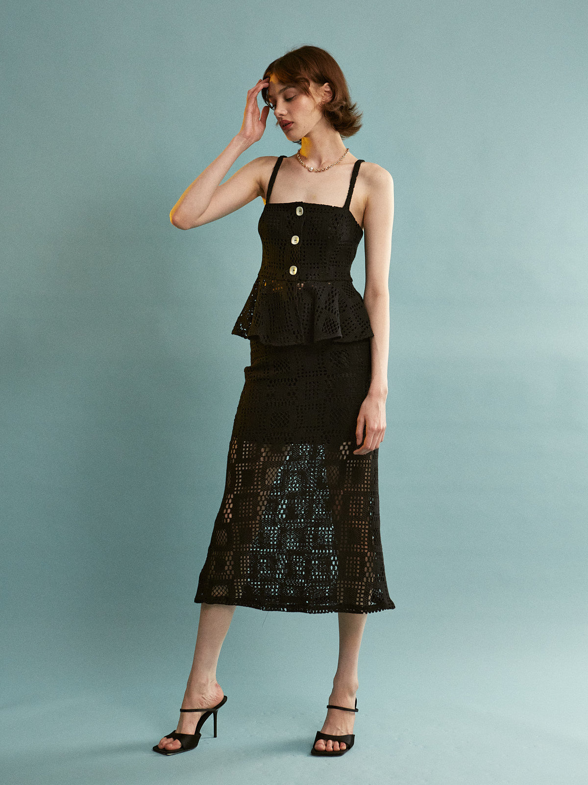 - Color & Pattern: Solid black with a monochromatic openwork lace/crochet pattern.