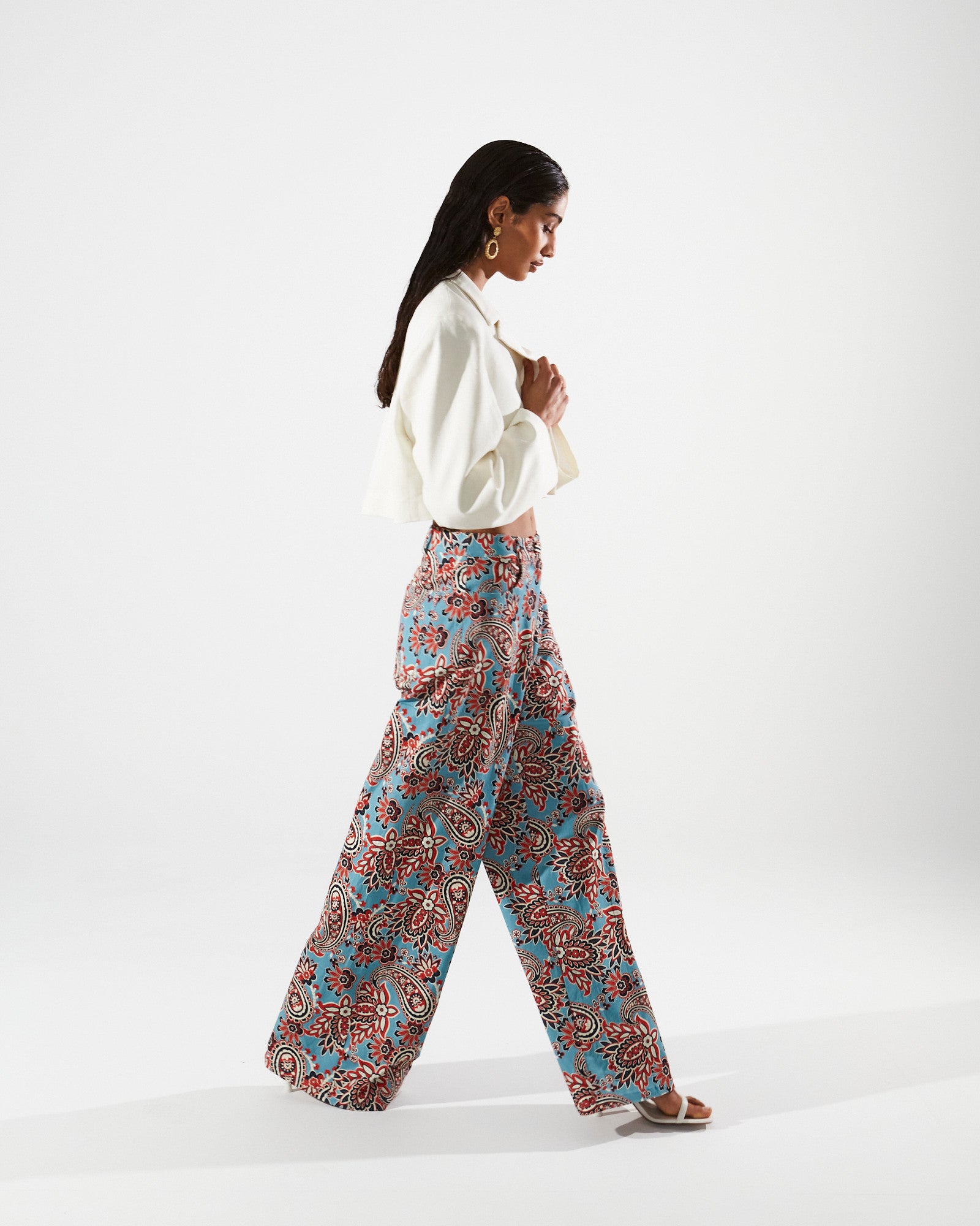 - Color & Pattern: The main colors are white for the blazer and blue, red, black, and white for the paisley motifs on the top and pants. The pattern is a paisley print with ornamental, swirling motifs and floral elements.