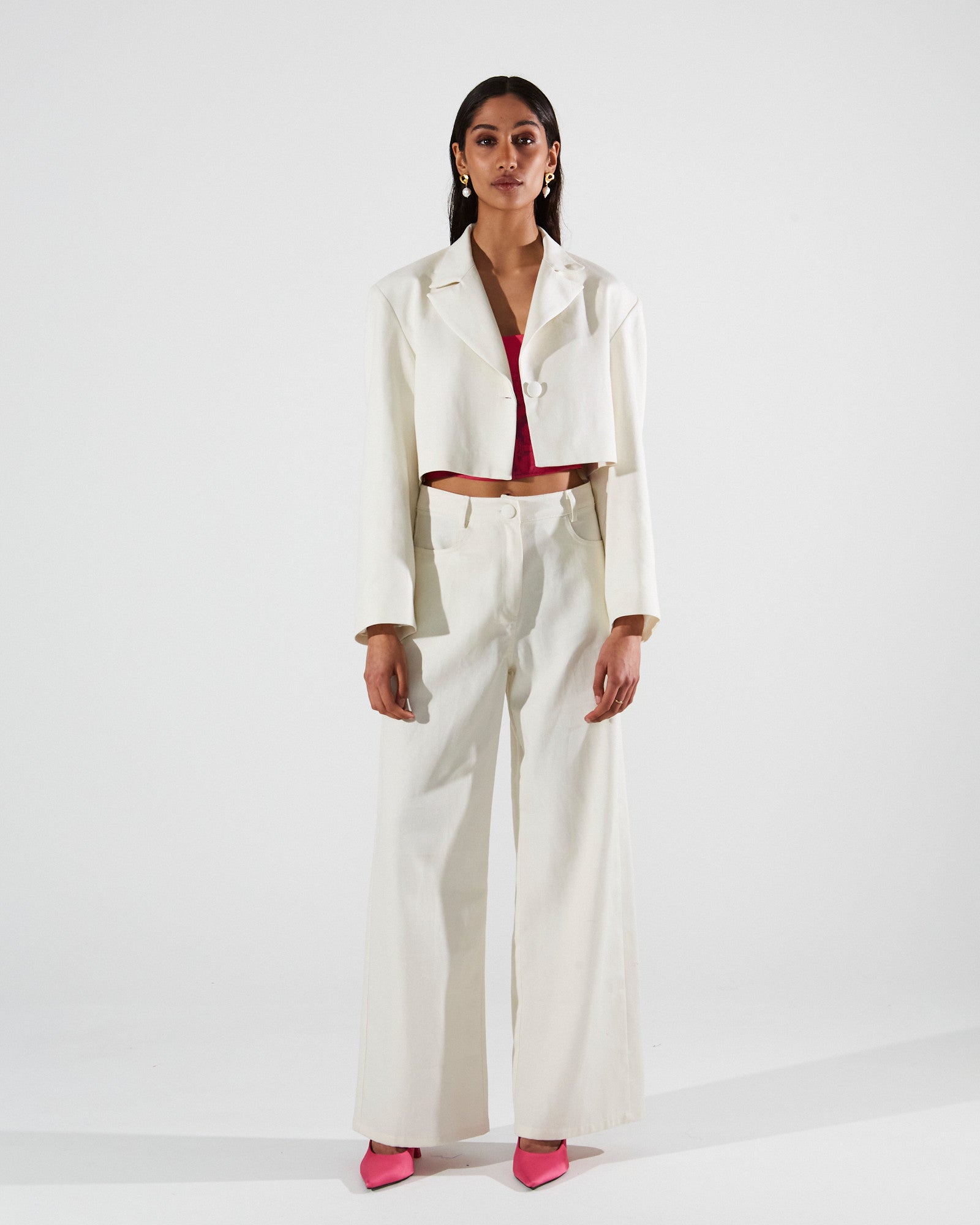 - Fit type: The blazer has a boxy, structured fit with shoulder padding. The top is form-fitting and cropped, and the pants are high-waisted, wide-leg with a relaxed fit.