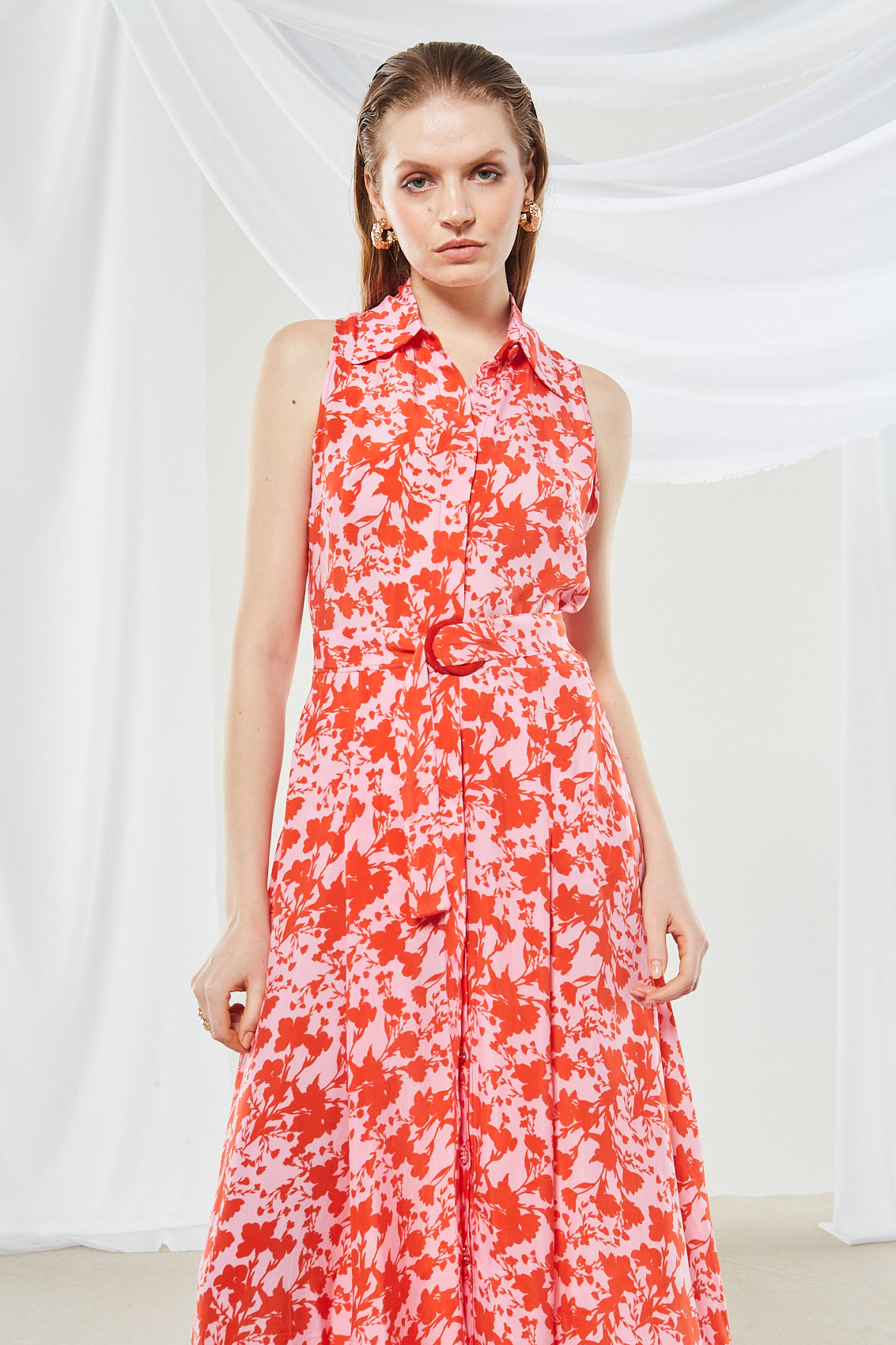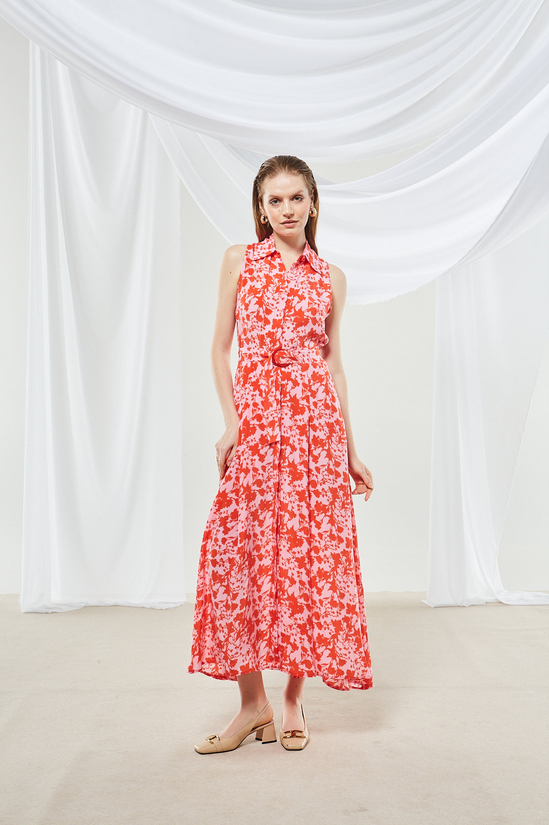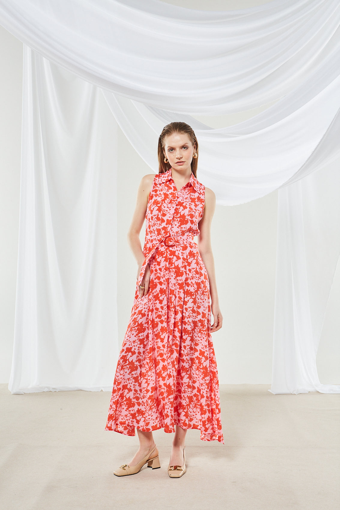 Make a stylish statement with this maxi dress featuring a large-scale, abstract floral print of bright red blooms on a light pink base. The collared, sleeveless shirt silhouette, combined with the A-line hem and red belt, creates a feminine, retro-inspired look with a modern, summery twist.