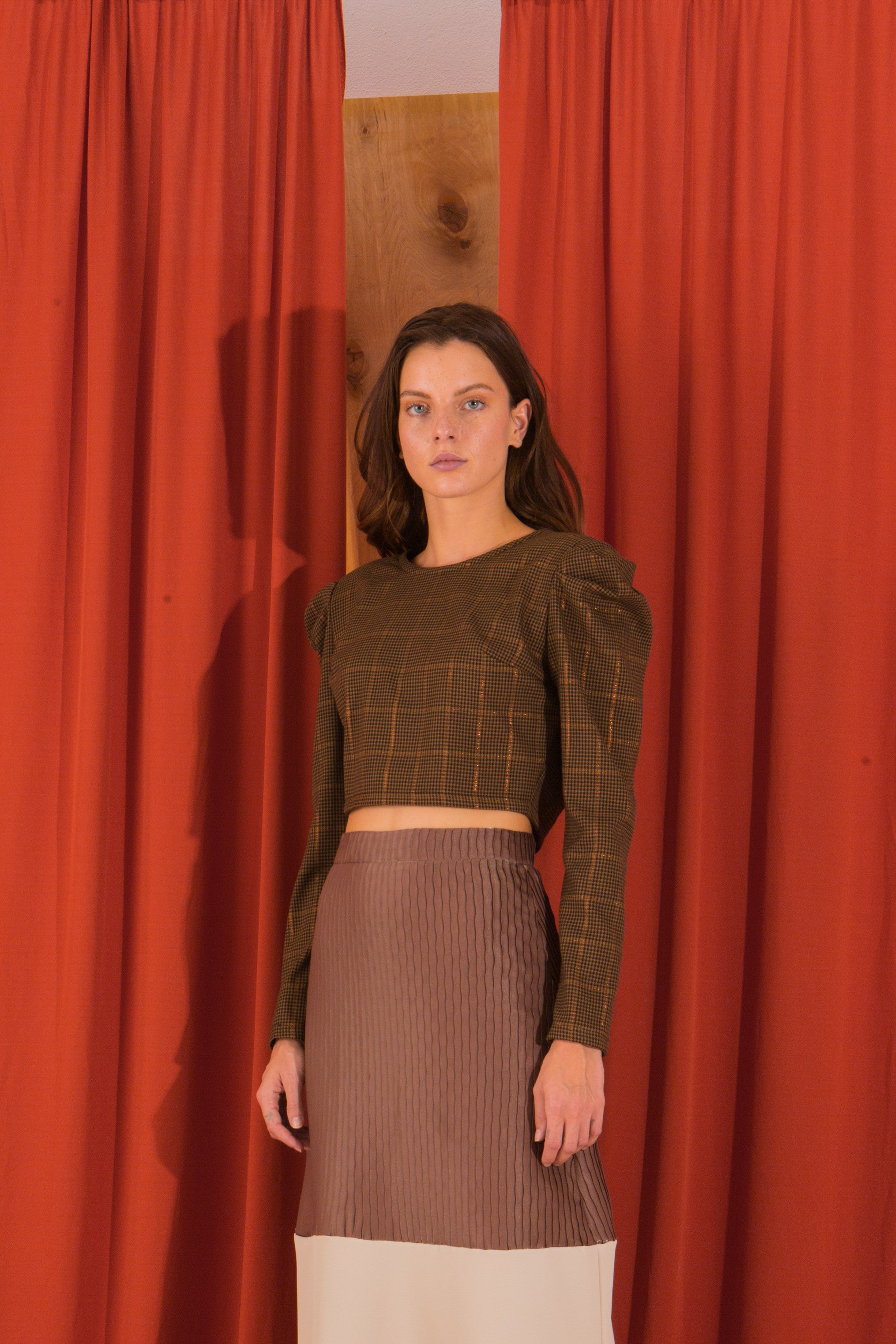 - Color & Pattern: The upper bodice has a checkered (houndstooth-style) pattern in brown and green, while the lower skirt features vertical stripes in brown and black.