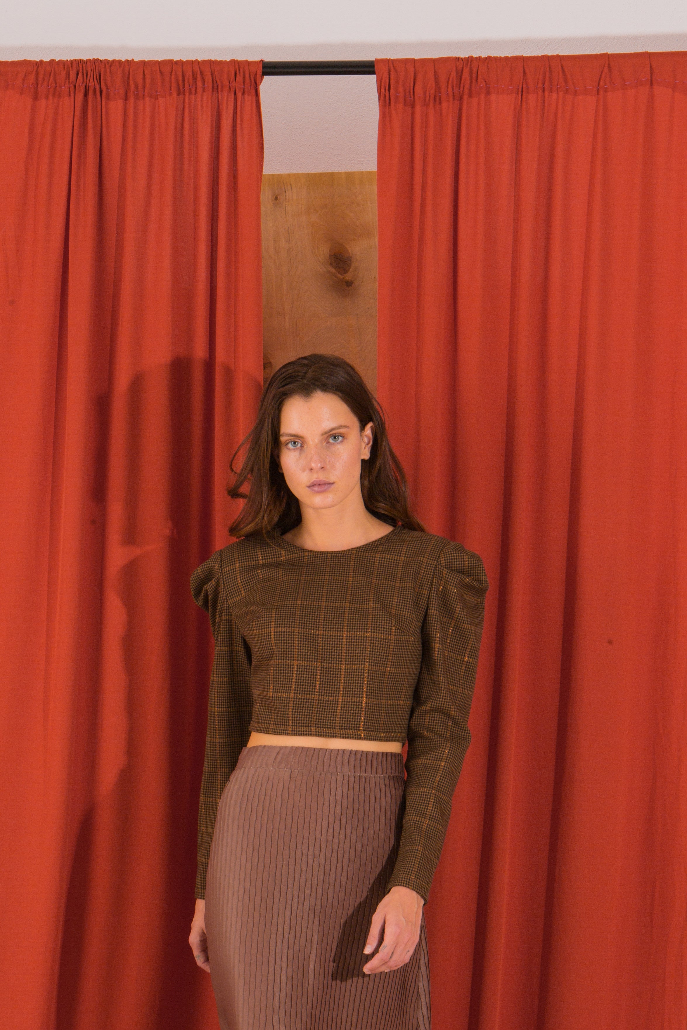 - Craftsmanship details: The structured puffed shoulders and vertical pleats/stripes are expertly crafted, showcasing high-quality construction.