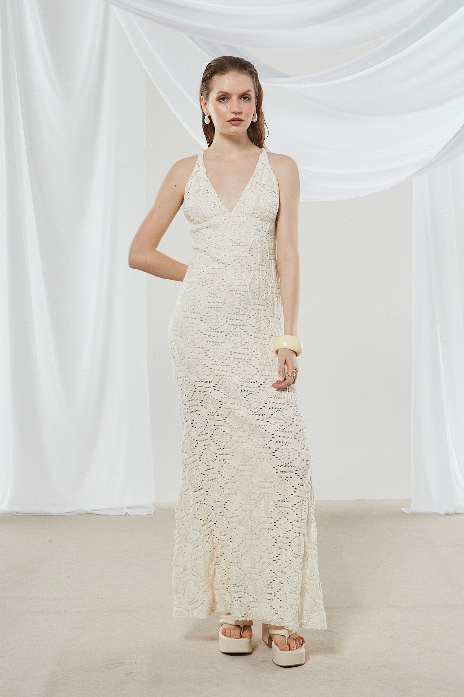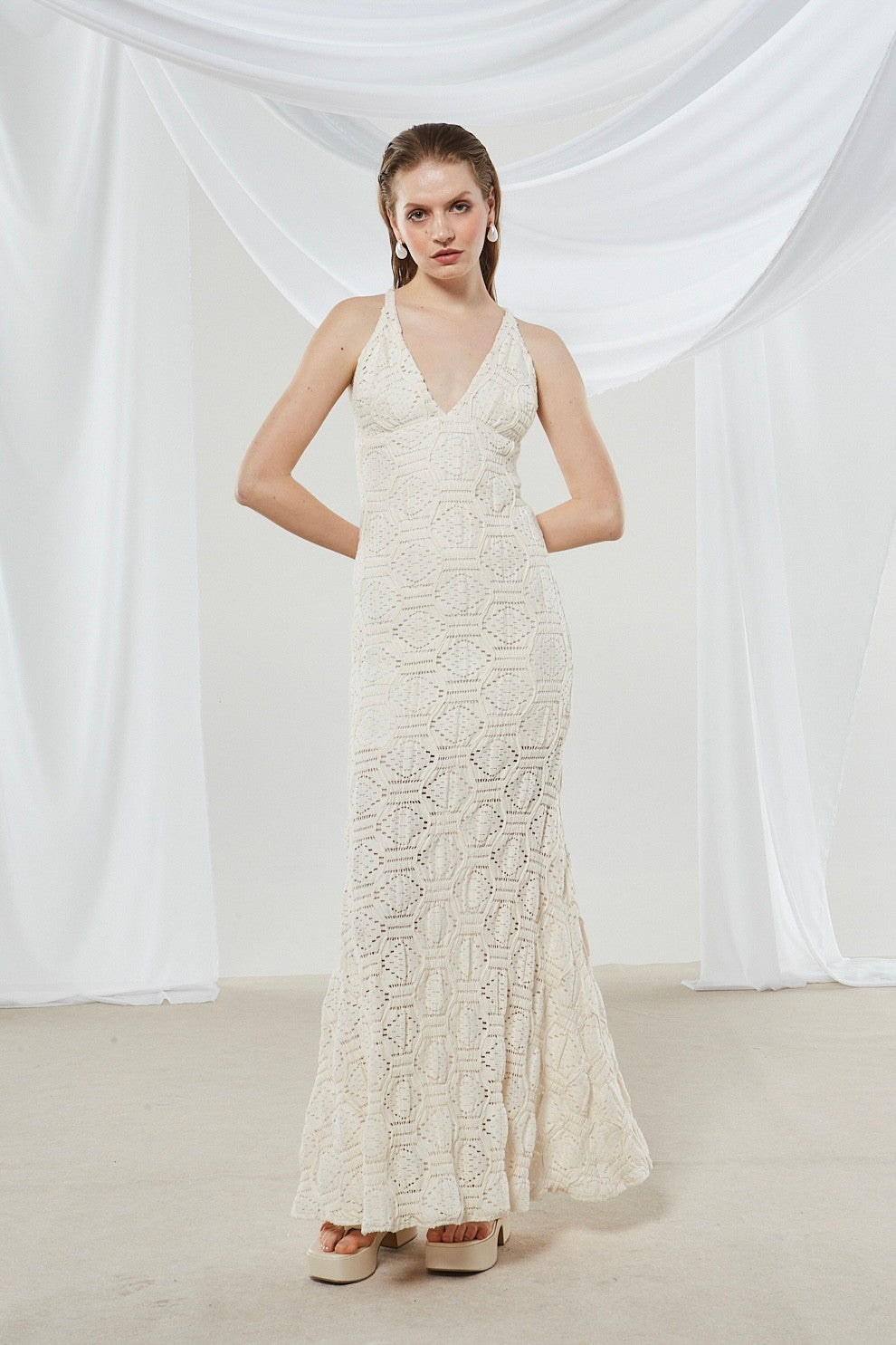 Indulge in the elegance of this cream-colored maxi dress. Its geometric openwork crochet pattern offers a monochromatic, textured look, while the straight hemline and form – fitting silhouette exude sophistication. The deep V – neck and sleeveless design add a touch of allure.