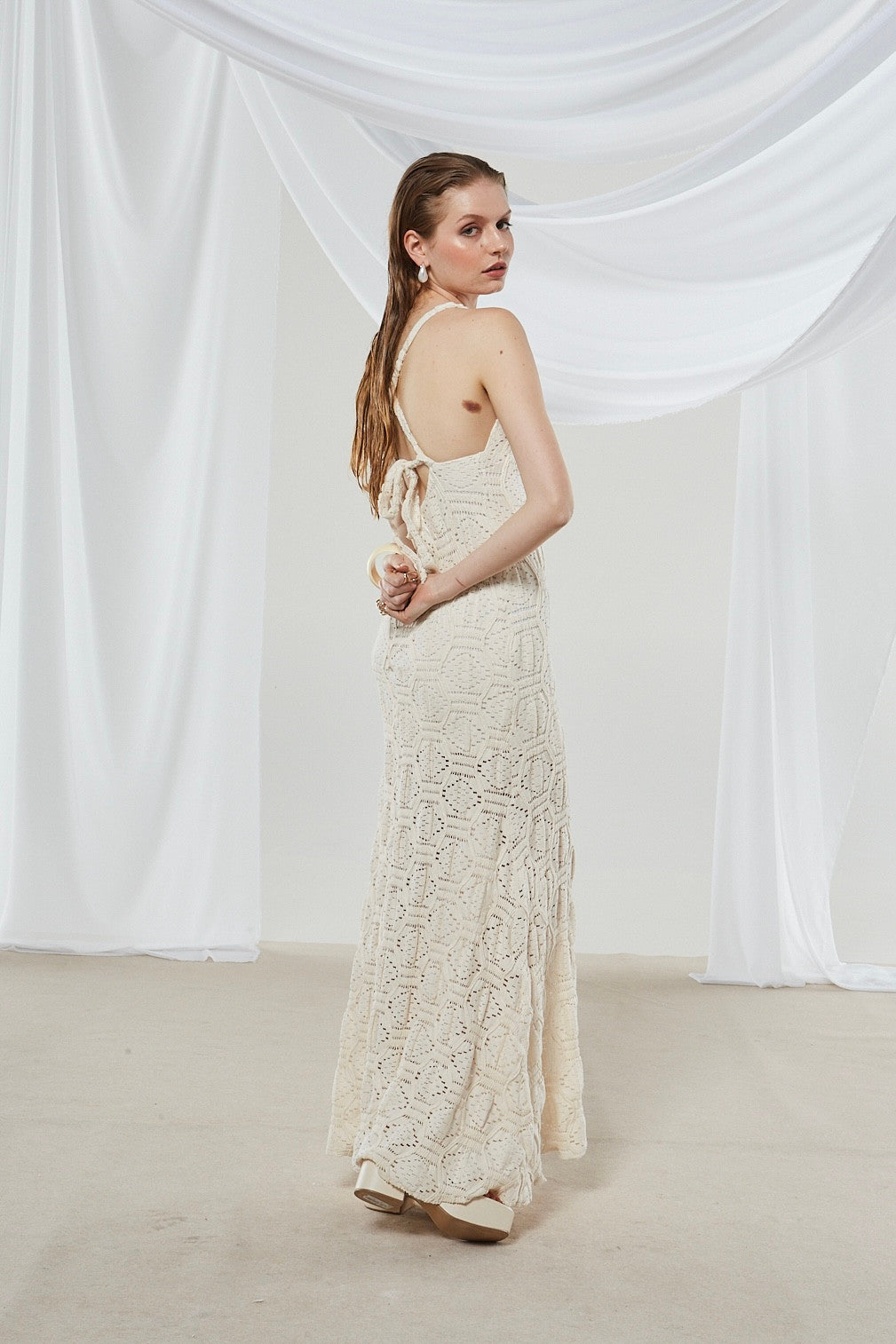 - Fabric characteristics: Crafted from crocheted lace, likely a blend of cotton. It has a textured, open – lace appearance with a matte finish and is slightly structured yet flexible.
