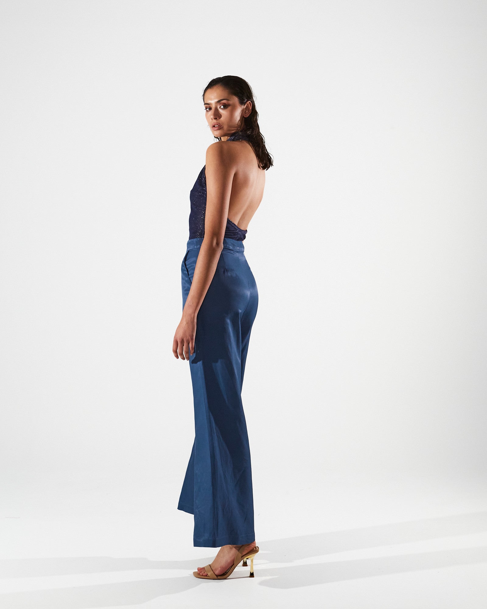 - Color & Pattern: The bodice is dark navy blue with a metallic sheen and a subtle metallic/sequin pattern, while the pants are a lighter, brighter blue solid color.