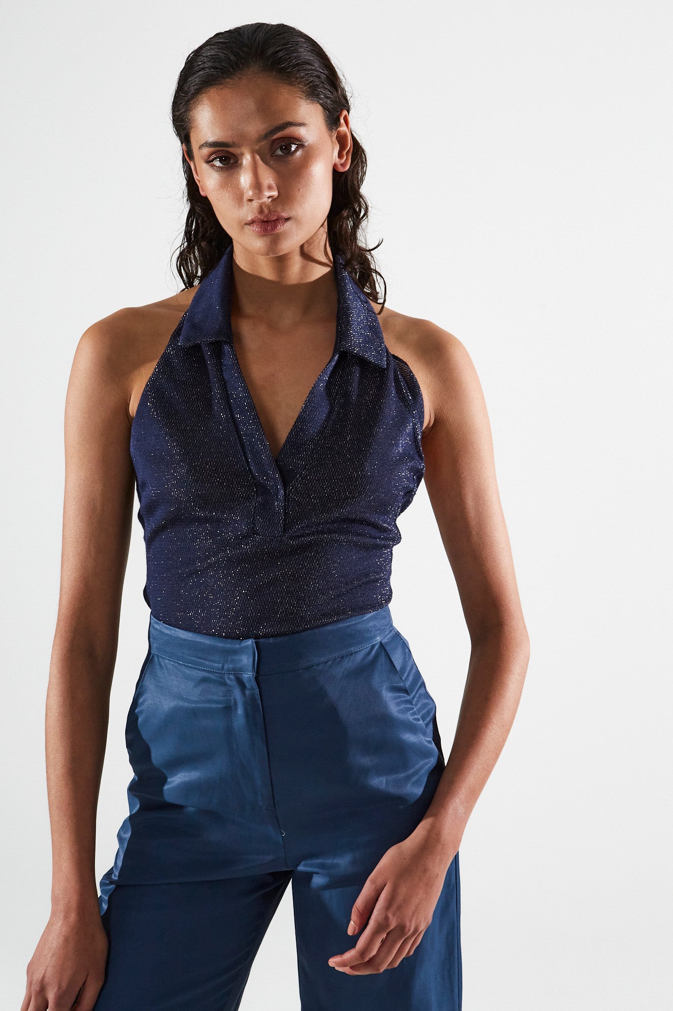 - Design features: Halter-style V-neck with a structured shirt collar, sleeveless, straight hemline on the pants, high-waisted waistband with visible seam detailing, and metallic threading in the top fabric.