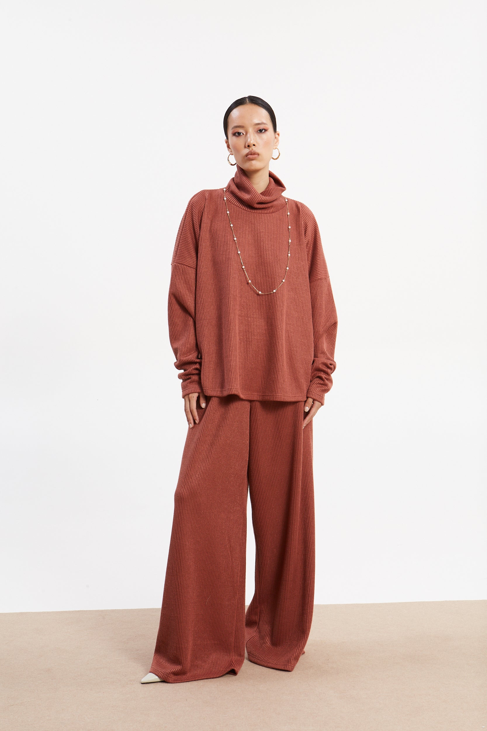 Indulge in the cozy charm of this terracotta turtleneck top. Crafted from a waffle-knit fabric, it features a distinctive grid-like texture that adds both warmth and visual interest. The oversized, relaxed fit makes it perfect for casual outings or relaxed gatherings.