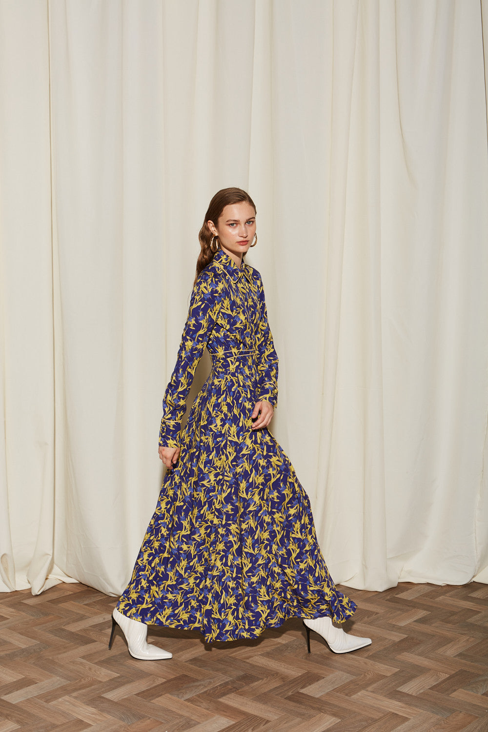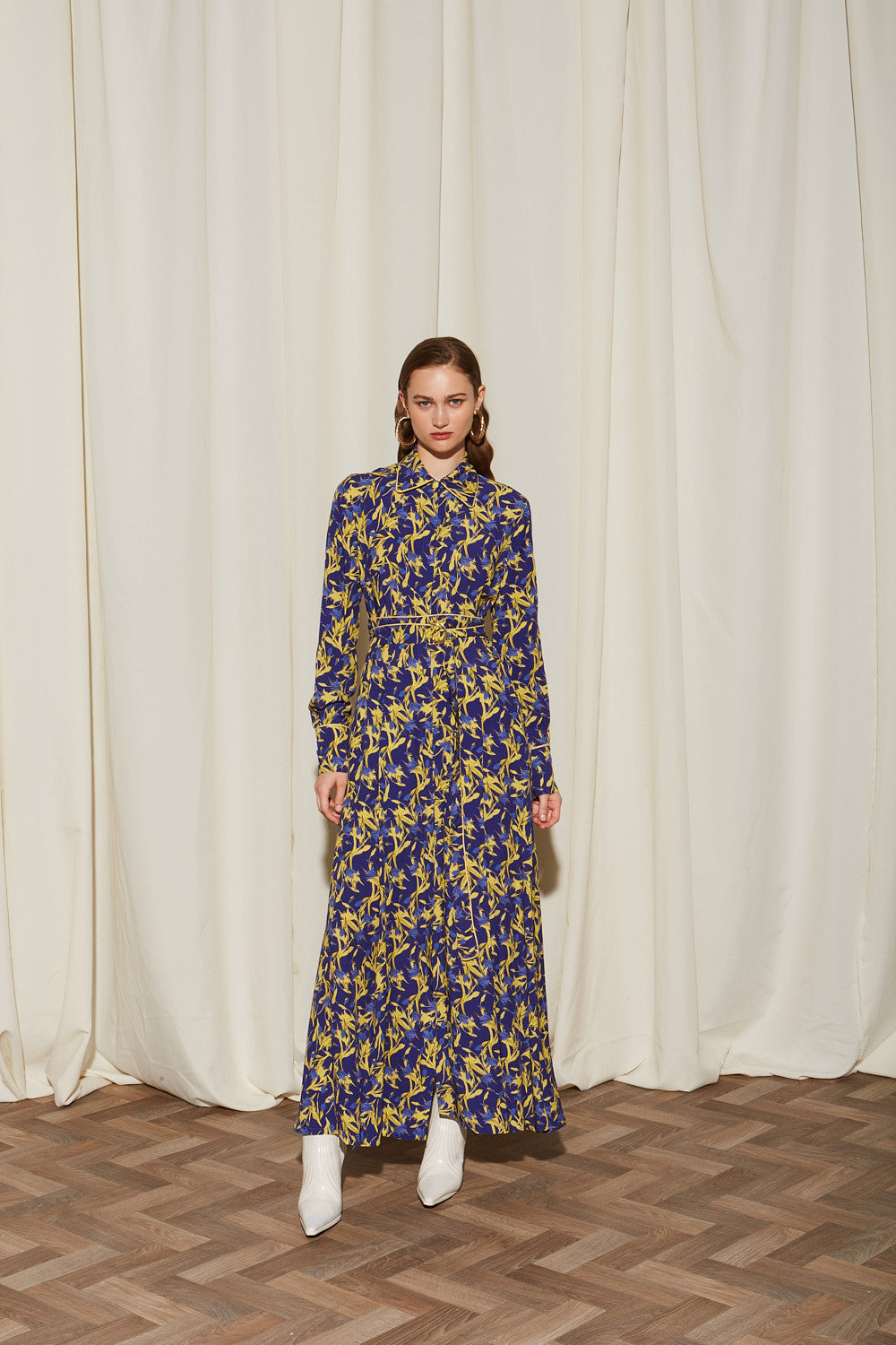 This elegant maxi dress features a deep royal blue base with a bold yellow botanical/abstract floral pattern. The collared shirt neckline and long sleeves add a touch of sophistication, while the belted waist and side slit create a flattering silhouette.