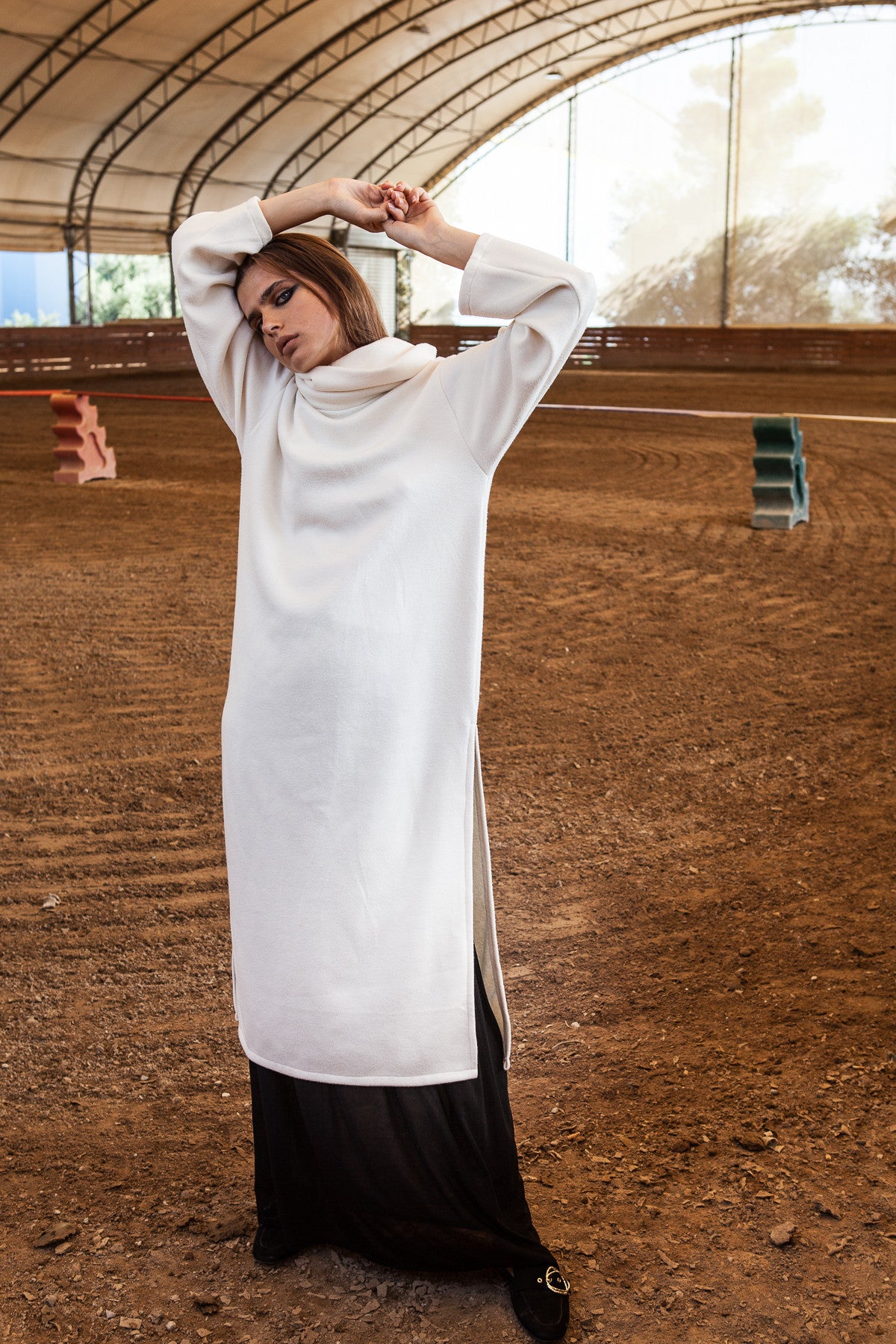 - Design features: High cowl neck, long relaxed – fit sleeves, straight hemline with a side slit