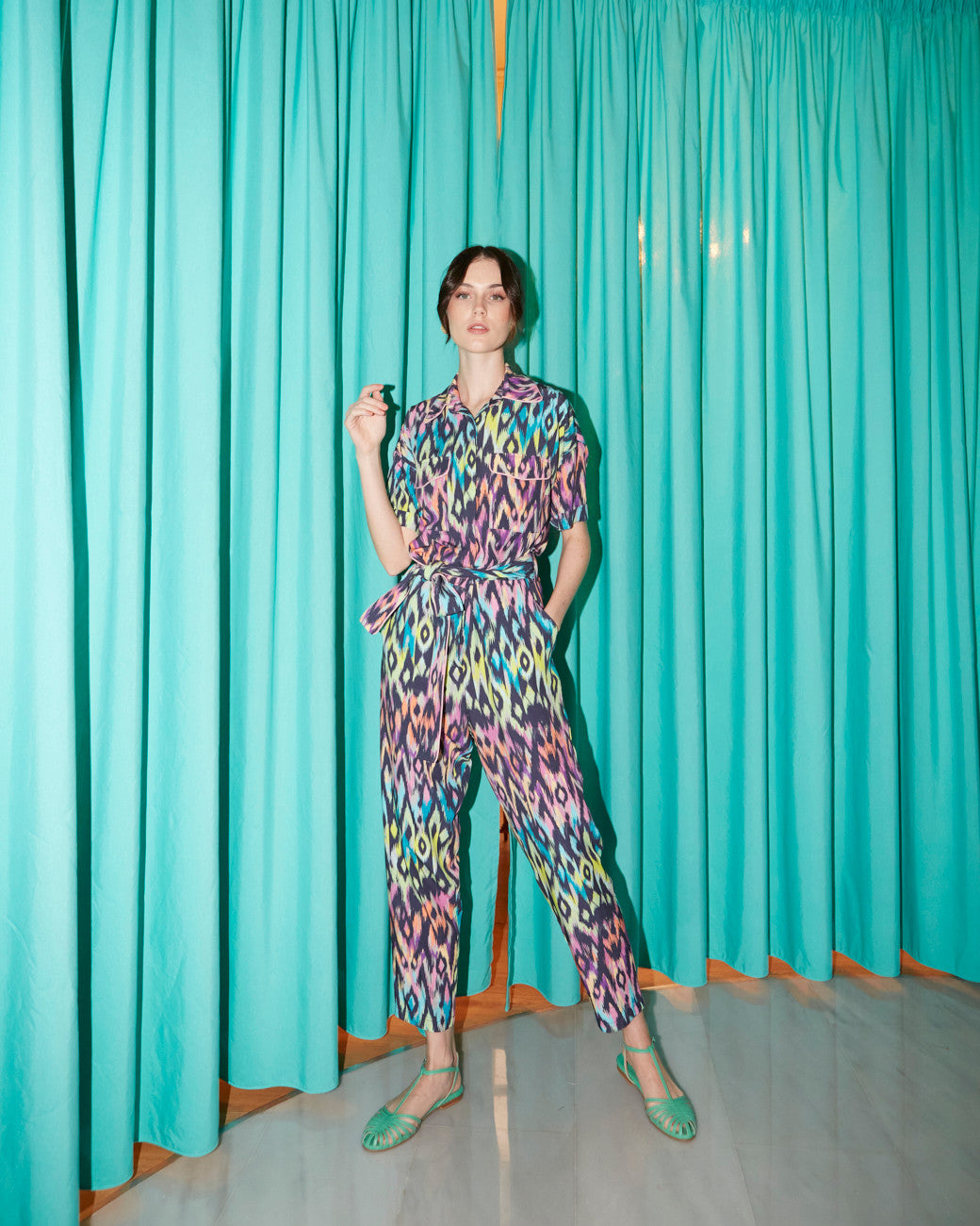 This jumpsuit is a vibrant and stylish piece that combines a bohemian – chic aesthetic with retro – modern undertones. It features a multihued ikat – inspired abstract geometric print with dominant tones of purple, pink, yellow, turquoise/blue, and a dark base. The lightweight fabric makes it perfect for warm – weather occasions.