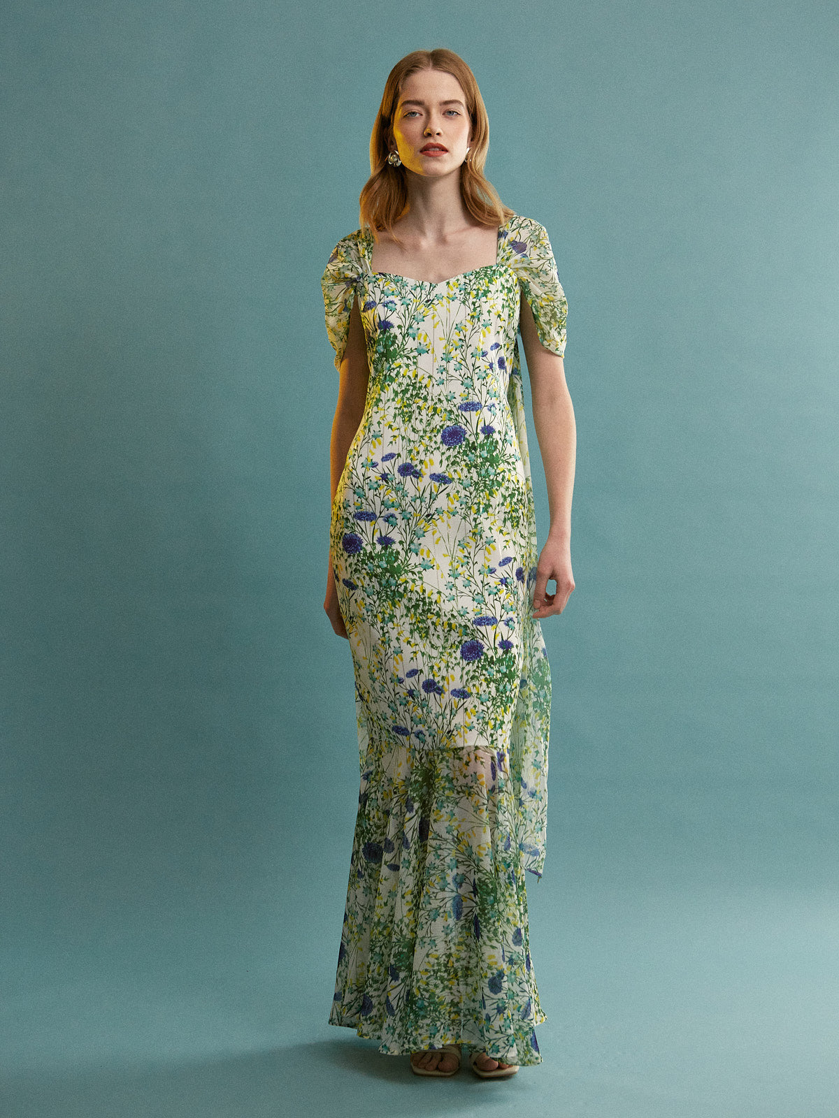Step into a world of bohemian romance with this stunning maxi dress. Crafted from lightweight chiffon, it features a beautiful wildflower floral print in soft, organic tones of white, green, blue/purple, and yellow. The flowing silhouette and cascading side panels create a dramatic, trailing effect, perfect for making a statement at any summer event.