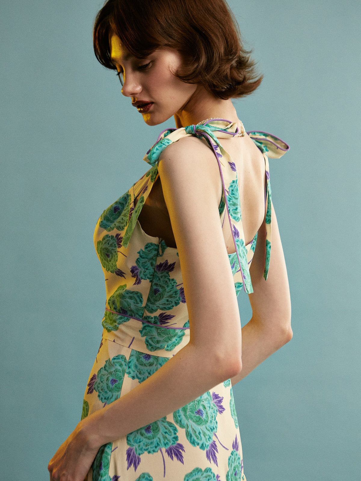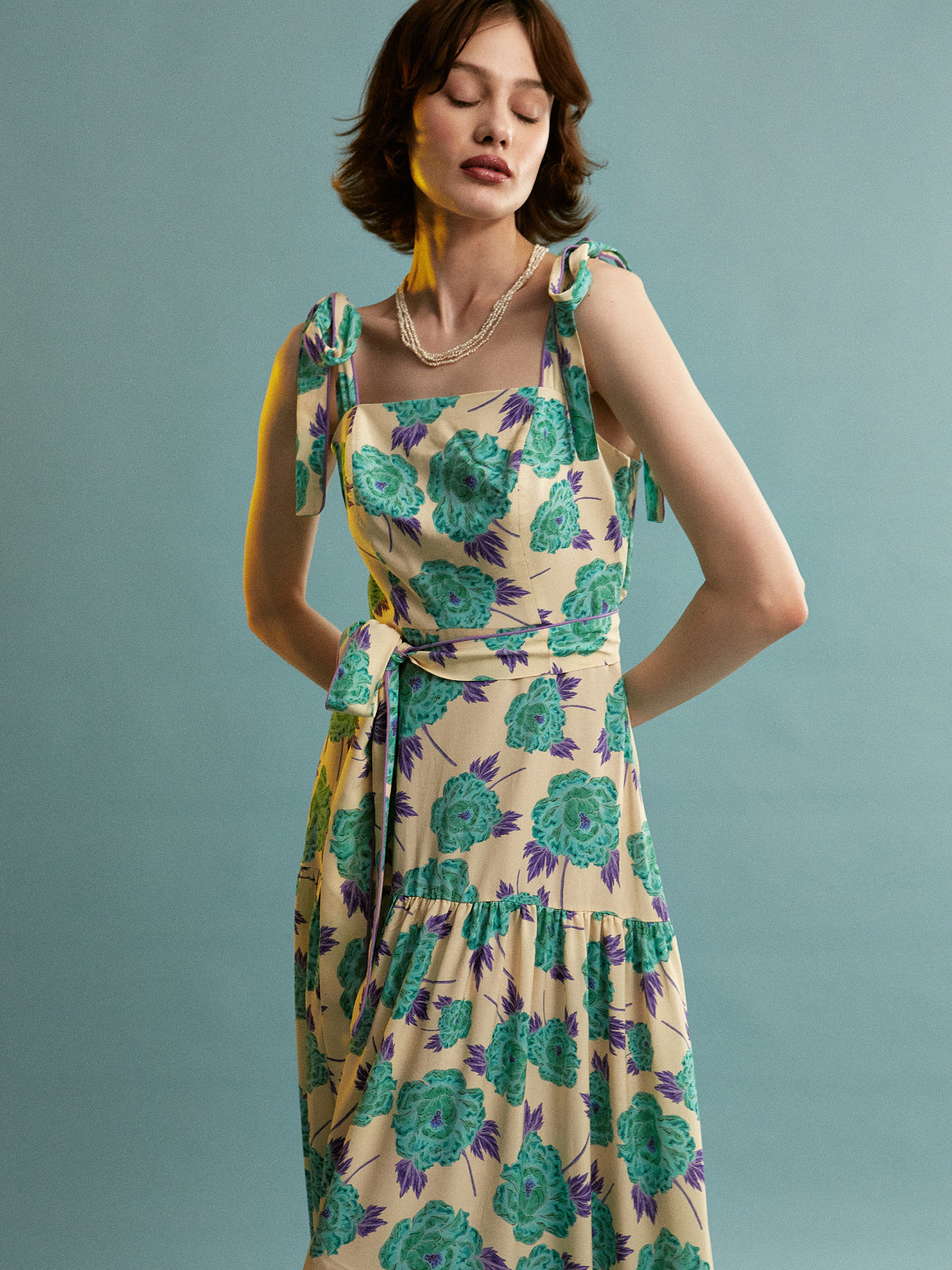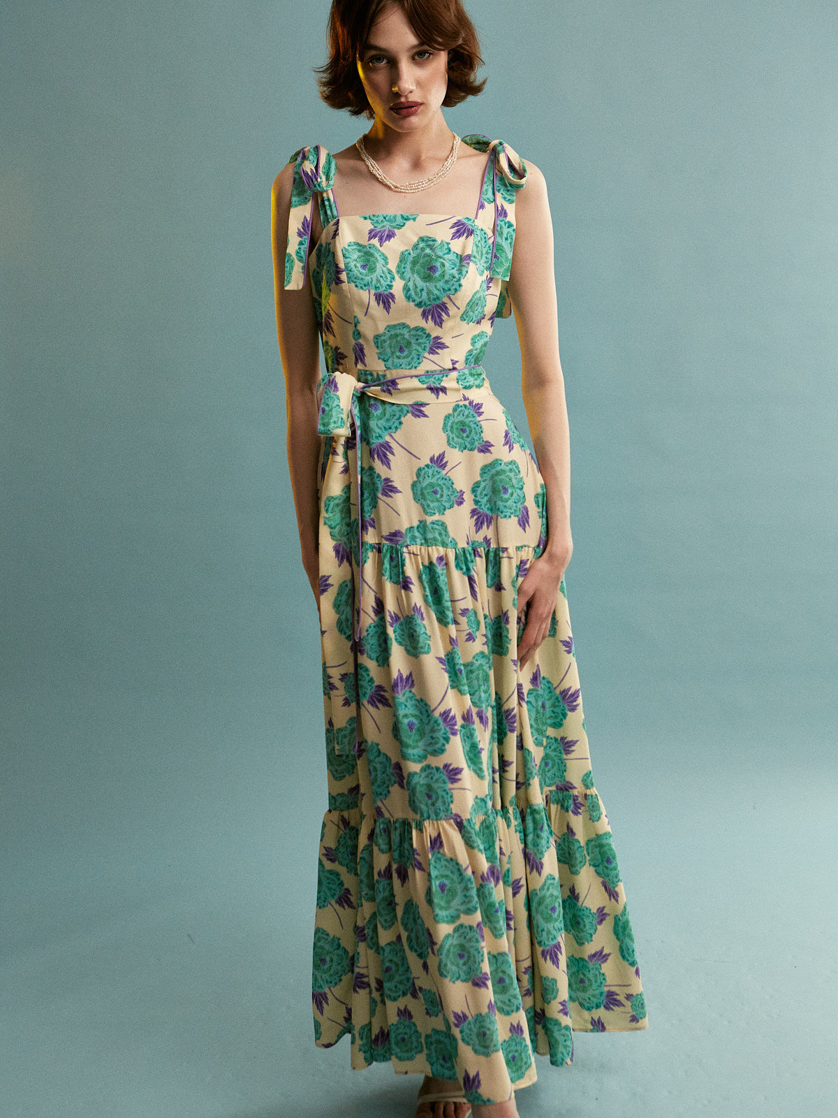 - Design features: Square neck with a fitted top, sleeveless design with decorative shoulder ties, a self – tie belt at the waist, and a tiered A – line hemline.