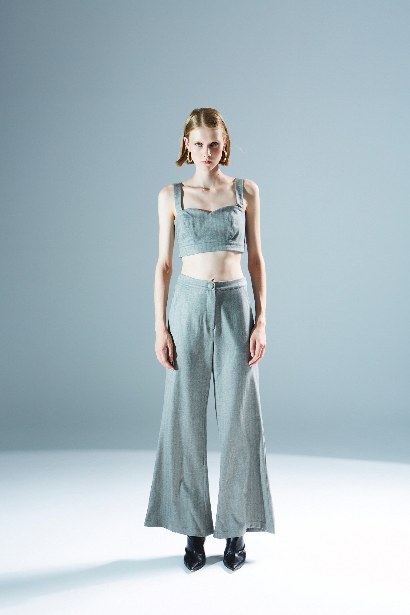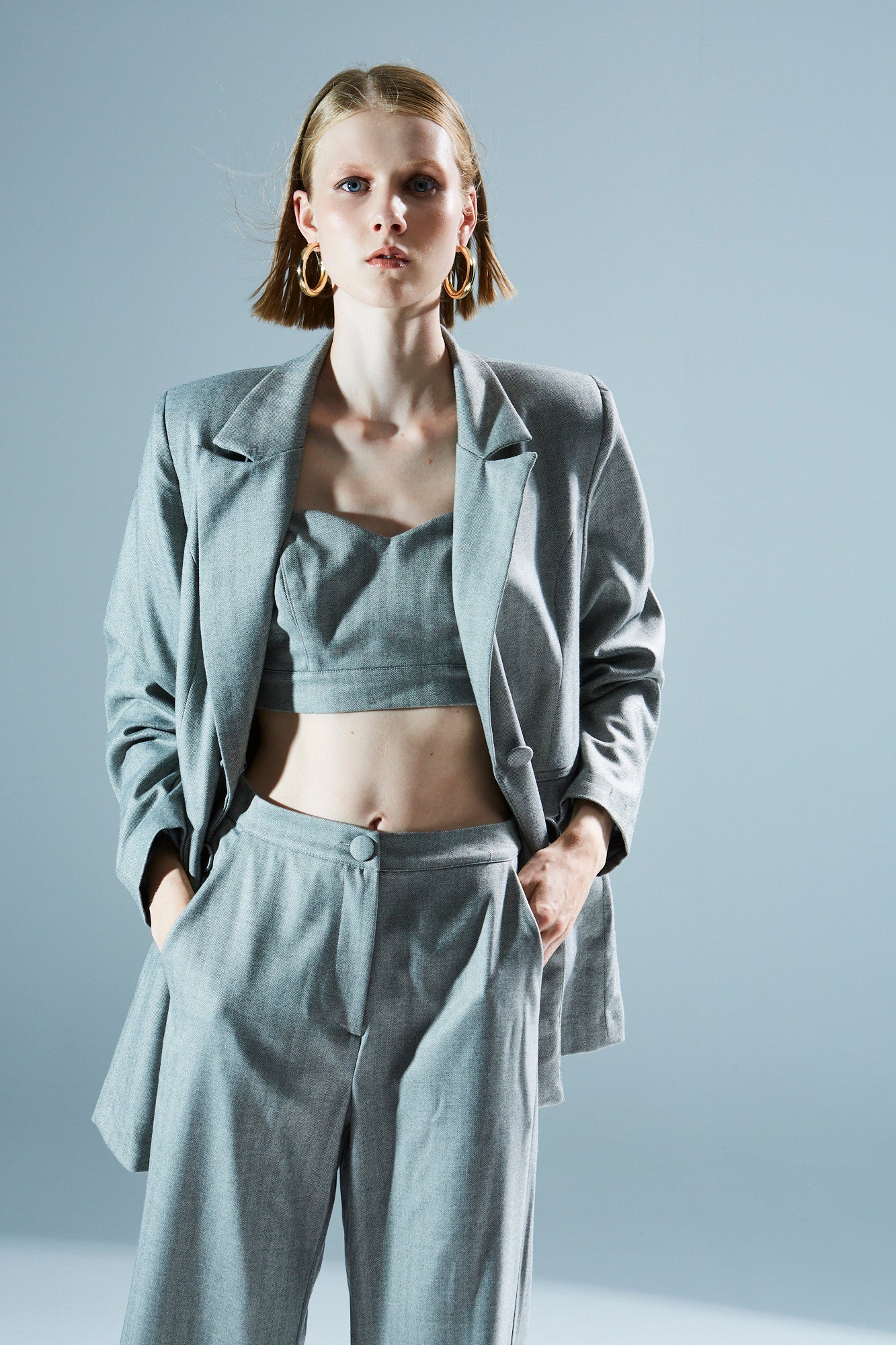 - Fit type: The blazer has a relaxed (oversized) fit with structured shoulders, the crop top is form – fitting, and the trousers are high – waisted, wide – leg (flared).