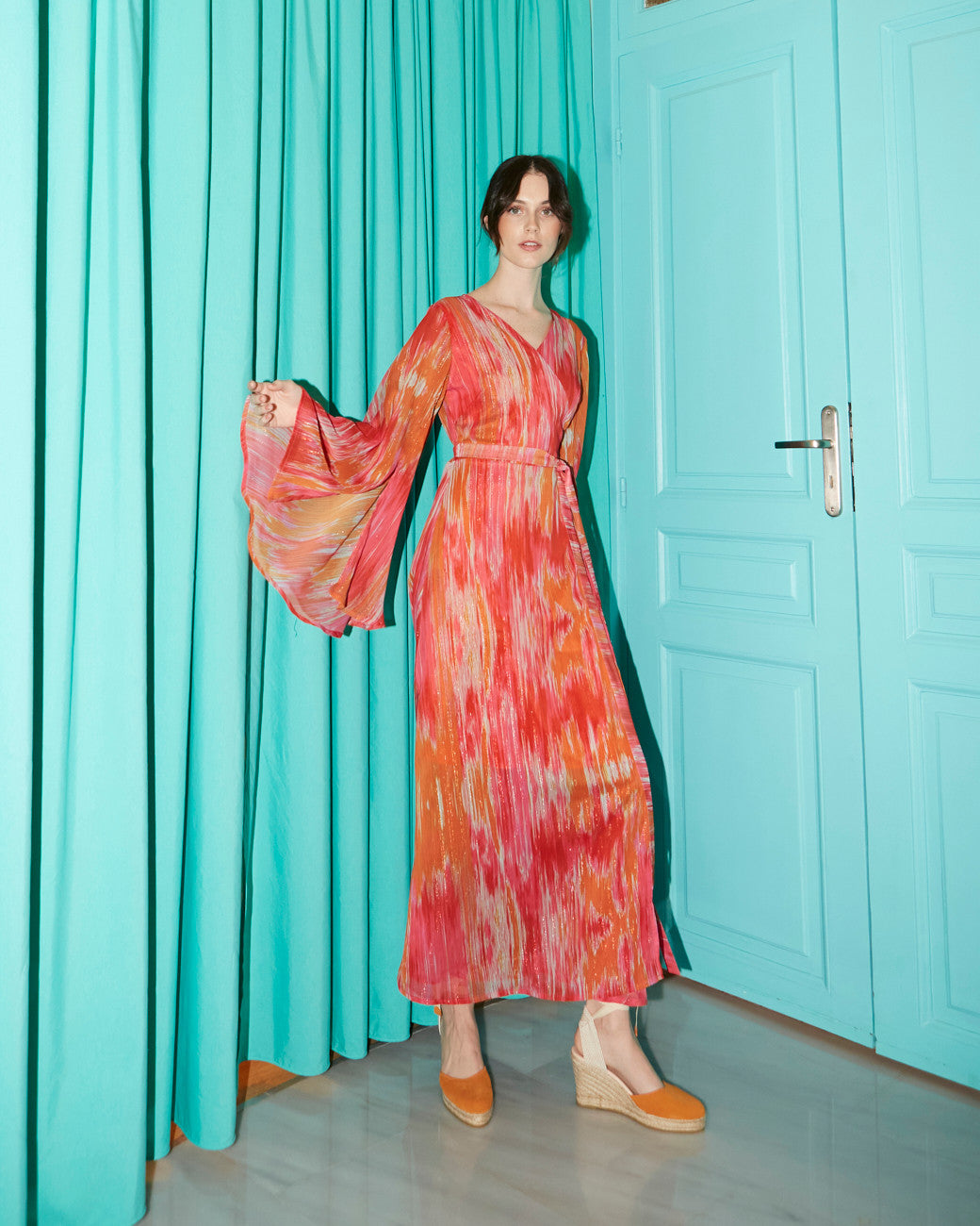 Step into the spotlight with this stunning maxi dress. It features a vibrant abstract marbled/ikat – like pattern in shades of crimson red, tropical orange, and accented with pink and white or light yellow. The boho – chic style is both free – spirited and elegant, perfect for a summer getaway or a special event.