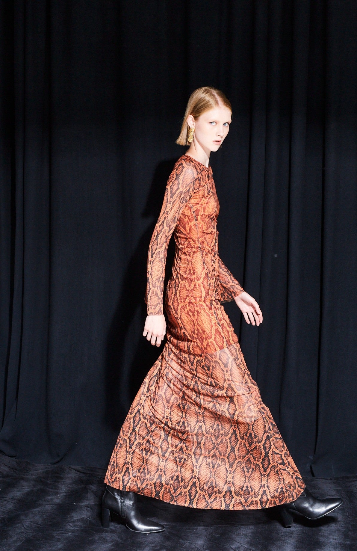 Make a bold statement with this stunning maxi dress. It features a captivating snake print in warm terracotta and black, creating an edgy – glamorous look. The long flared sleeves and high slit add a touch of drama, perfect for formal evening events.