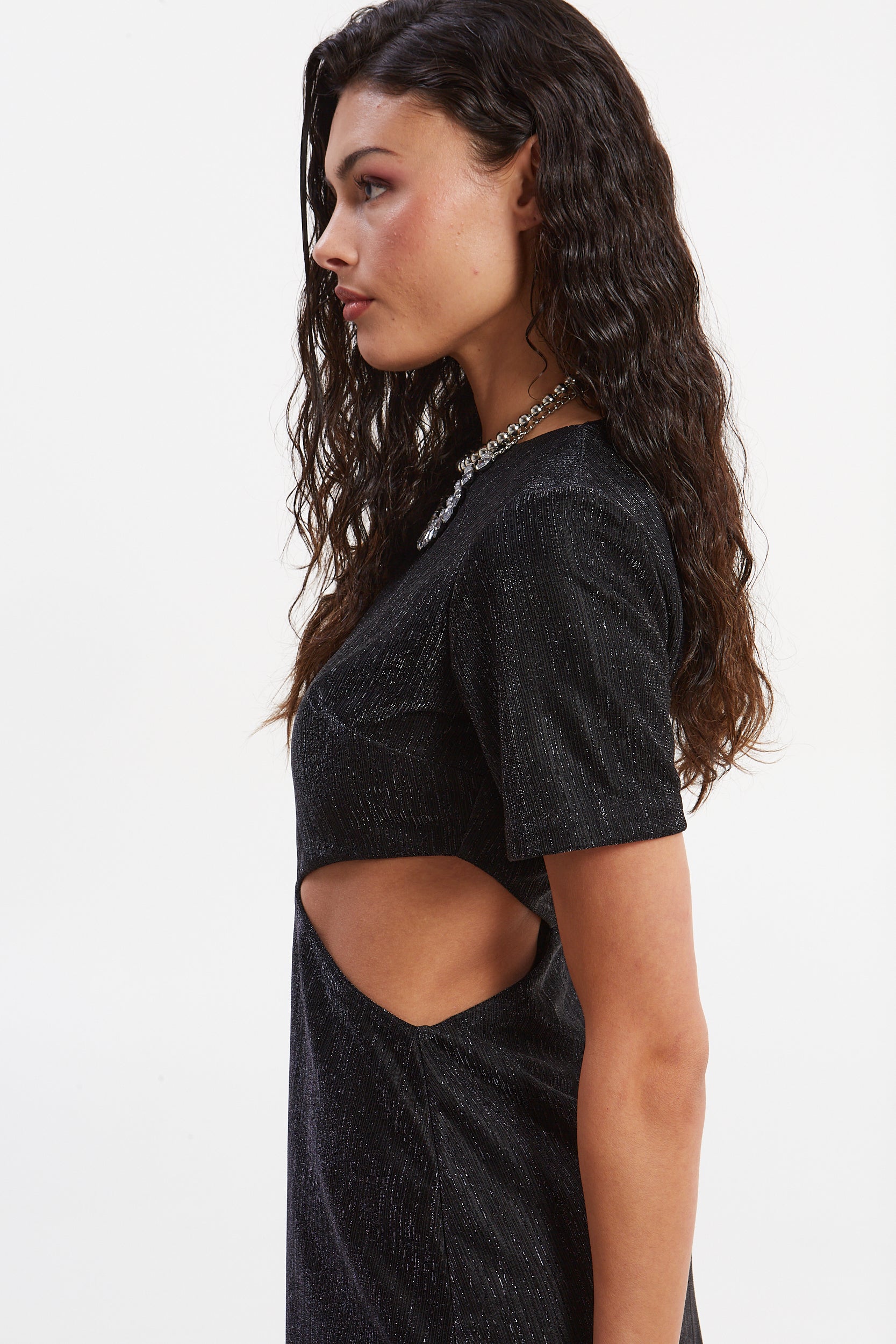 Make a bold statement with this stunning black mini dress. Featuring a subtle metallic sheen and a strategic back cutout, it combines edginess with elegance, perfect for formal events and parties.