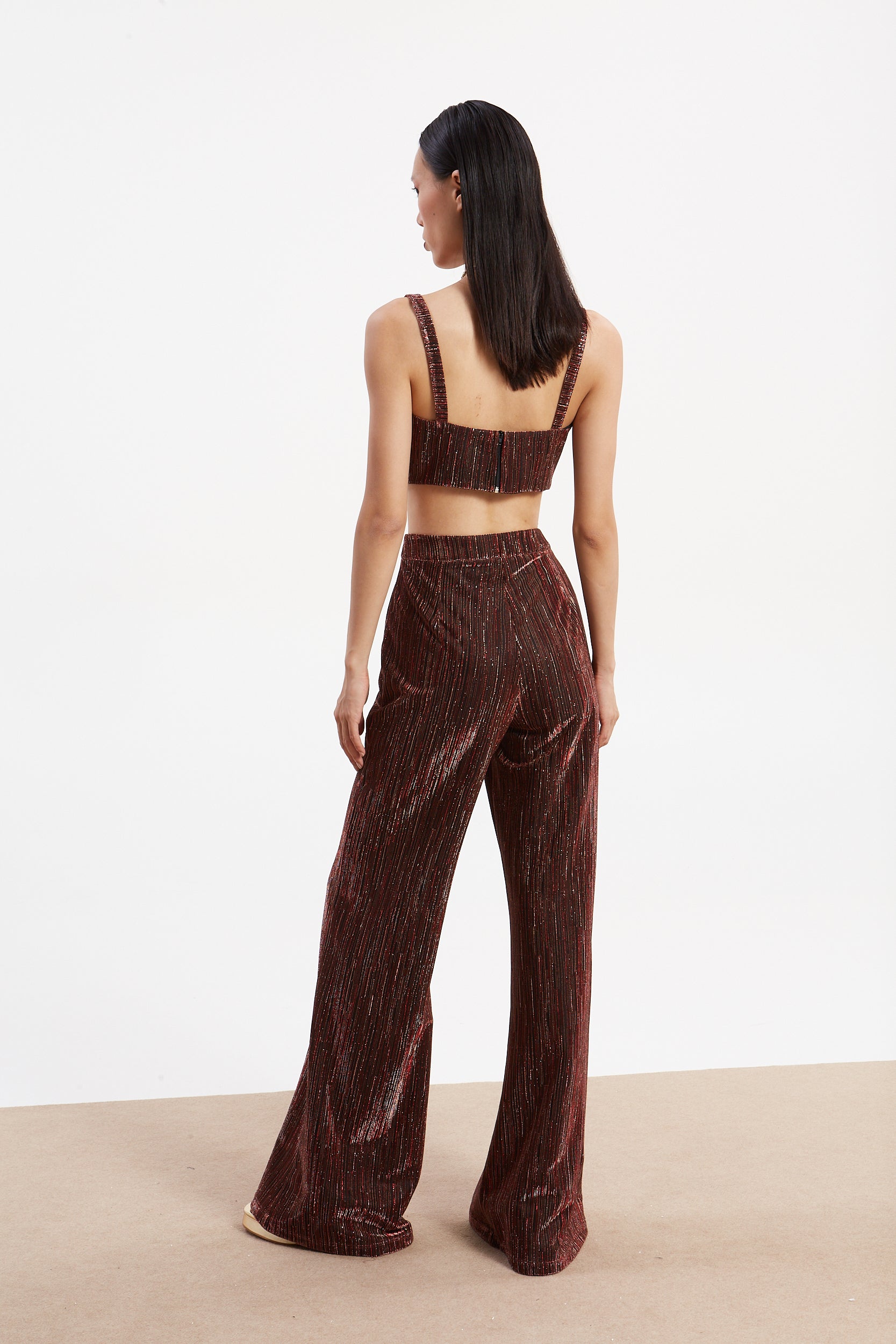Pair the bustier top with the trousers and leave the blazer off for a more daring and contemporary look. Add some high – heeled gold sandals to enhance the metallic effect. Or wear the full set with a pair of classic black pumps for a more elegant and timeless style.