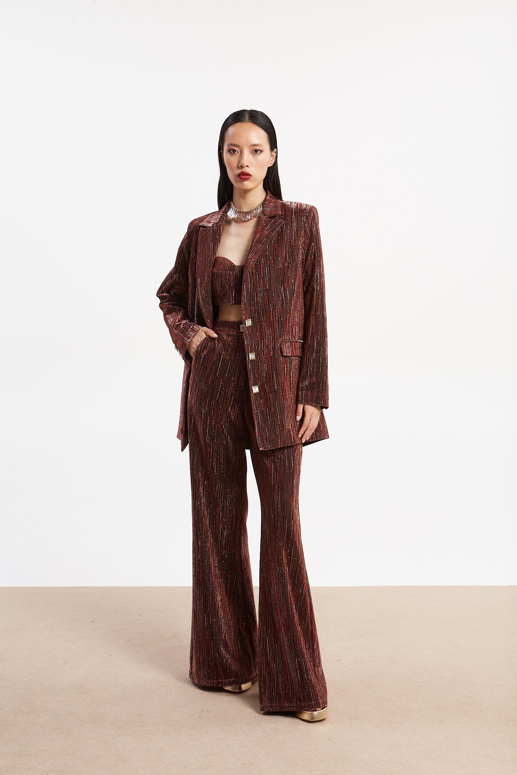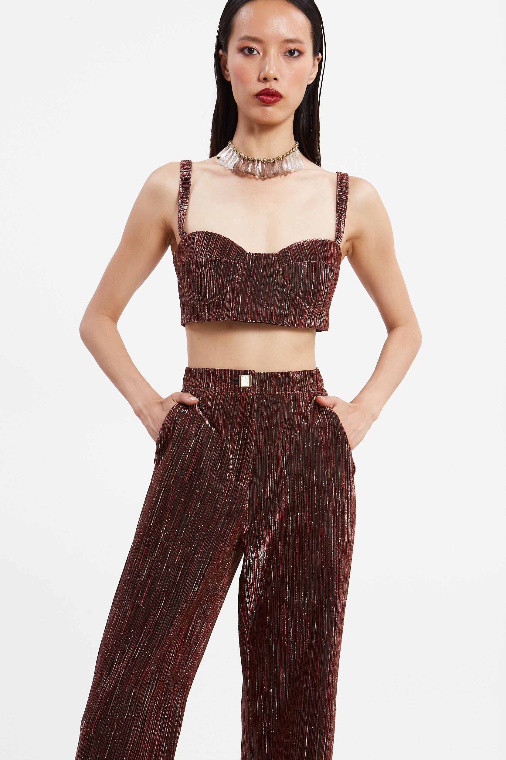 Introducing a glamorous two-piece set featuring a cropped bustier-style top and high-waisted wide-leg trousers. The rich, warm metallic bronze/copper color with fine vertical metallic threads creates a shimmering, striped effect, perfect for making a statement at formal events.