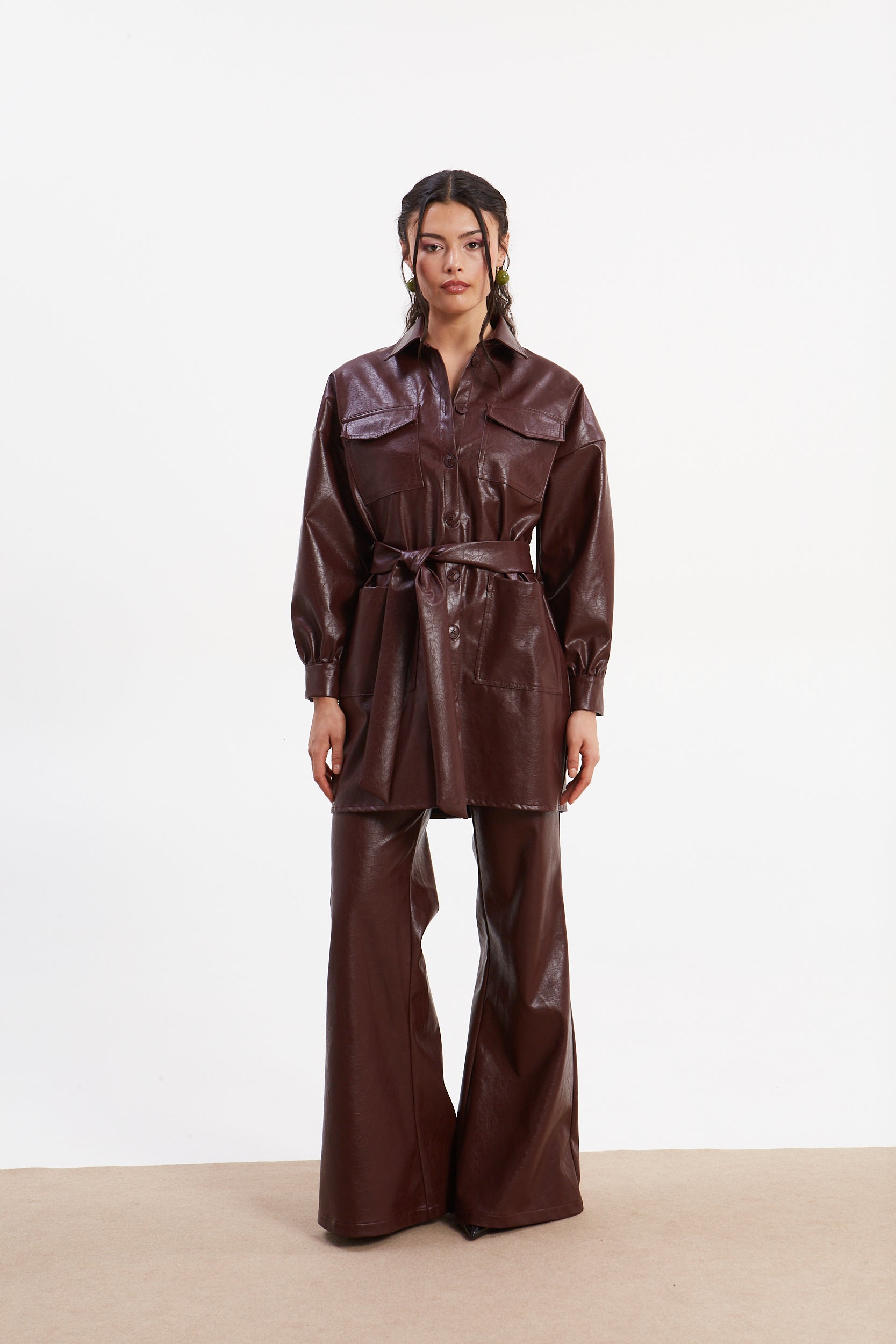 • Fabric characteristics: Made from a smooth, shiny, and visually reflective metallic stretch fabric, which conforms closely to the body’s contours.