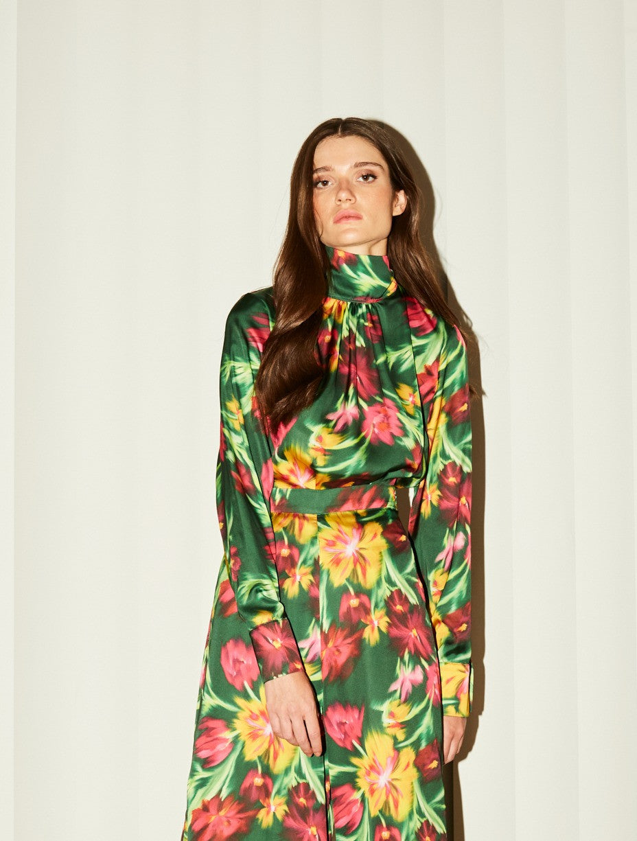 • Color & Pattern: Green base with large-scale floral print featuring red, yellow, and green floral motifs.