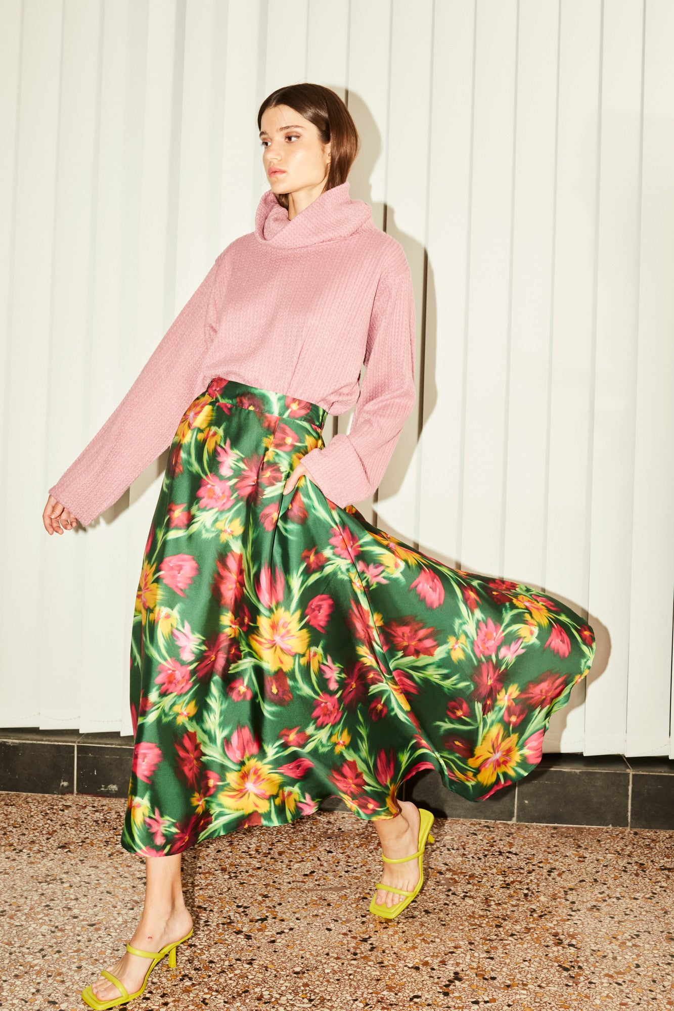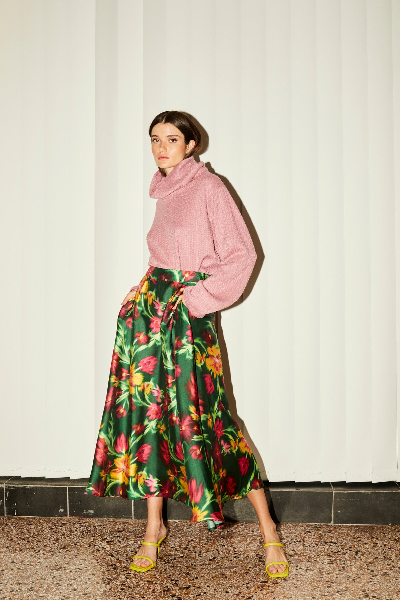 - Color & Pattern: Dominant green base with red, yellow, and pink floral accents in a large-scale floral print.