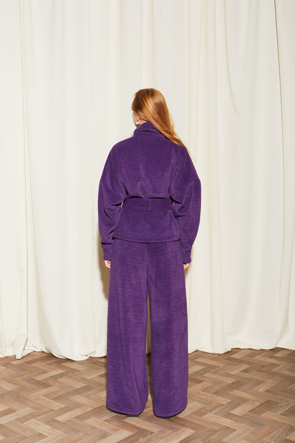 - Fabric characteristics: Made from a thick, textured knit fabric, plush, fuzzy, and matte, with moderate stretch.