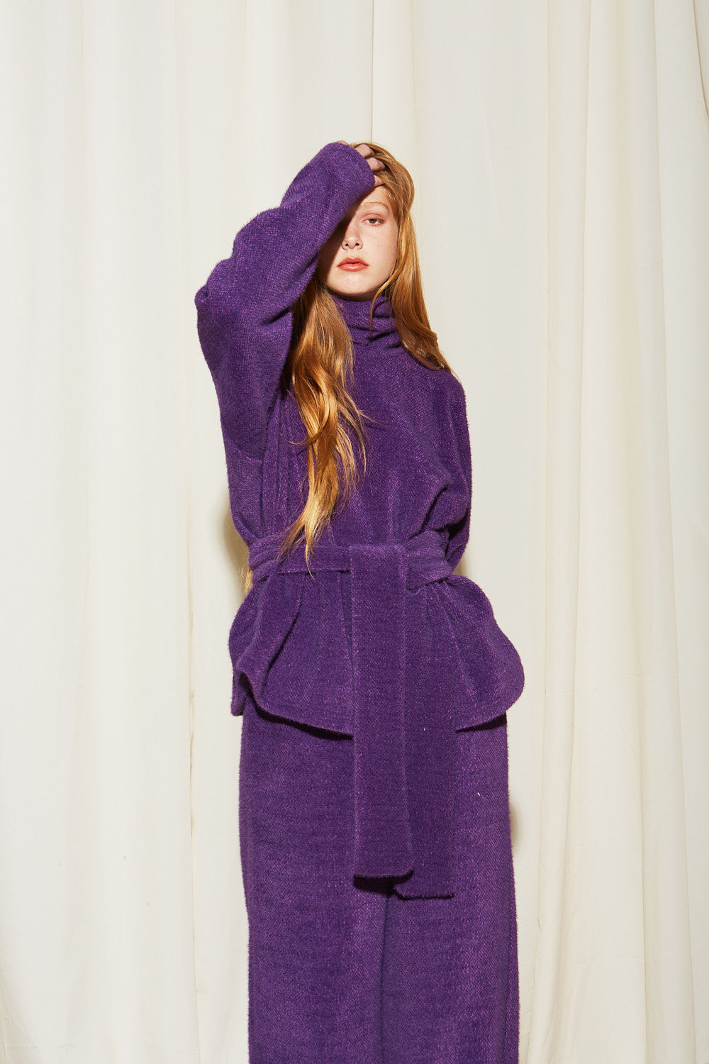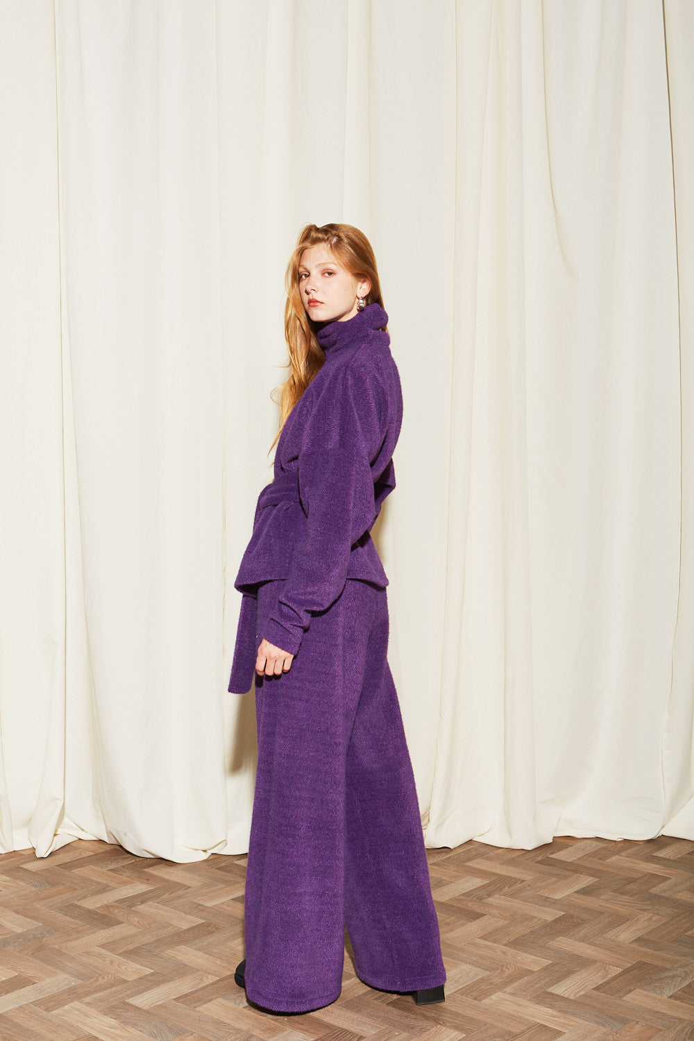 - Fit type: Loose, oversized with a belted, wide – leg A – line silhouette.