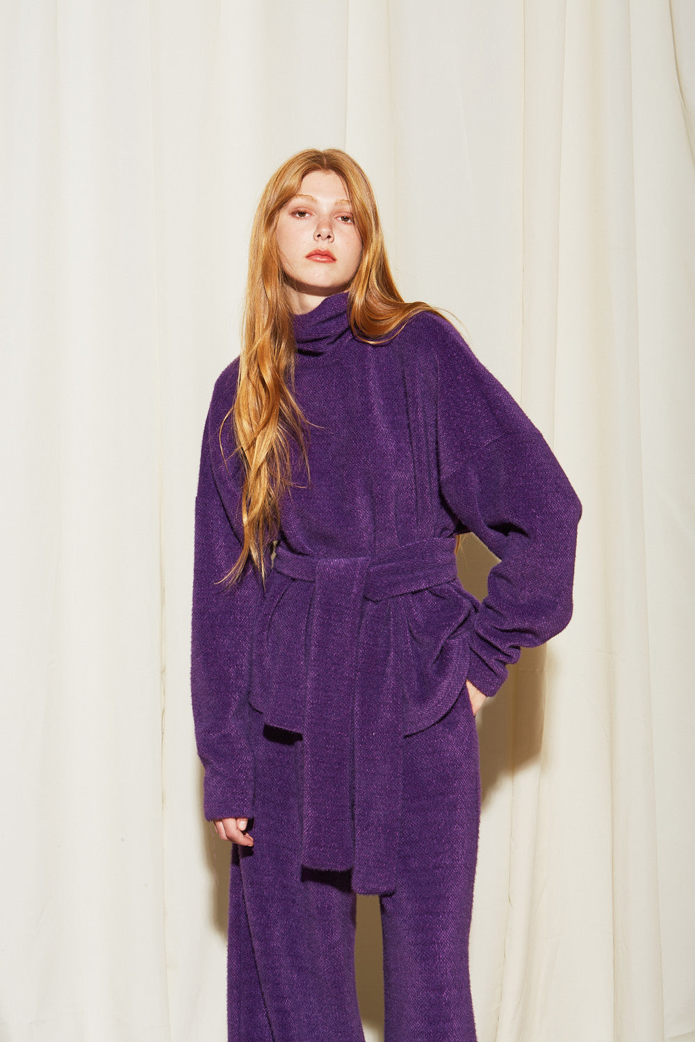 - Design features: Turtleneck neckline, long sleeves, straight hemline, and a self – tie sash belt at the waist.