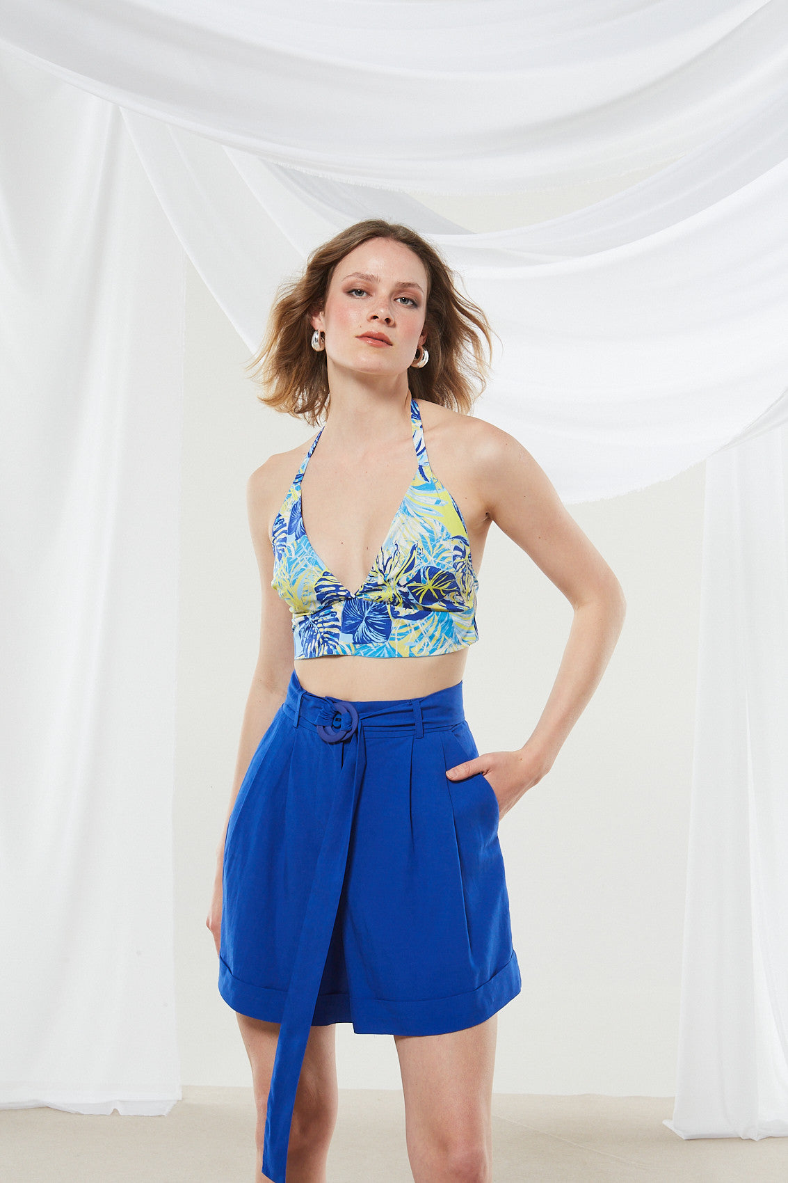 These royal blue high-waisted shorts are a standout piece in a resort/casual-chic style. Paired with a short-sleeved jacket and a tropical floral crop top, they create an effortlessly polished and laid-back summer look.