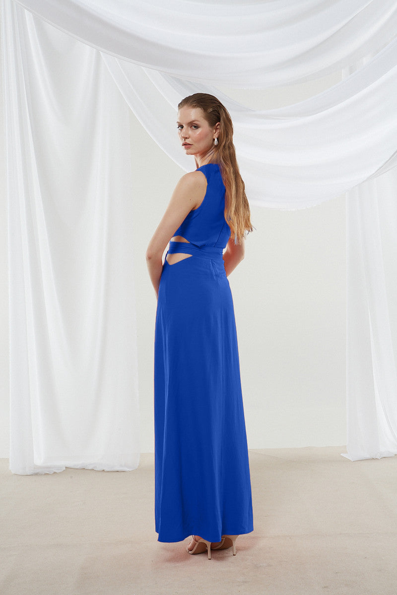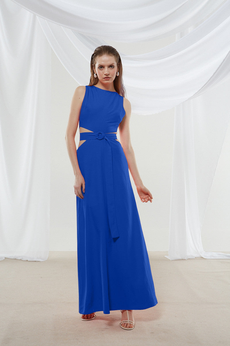 This elegant maxi dress in vibrant cobalt blue is a sophisticated and modern choice for special occasions. With its structured silhouette, side cut-outs, and self-tie waist belt, it combines style and elegance.