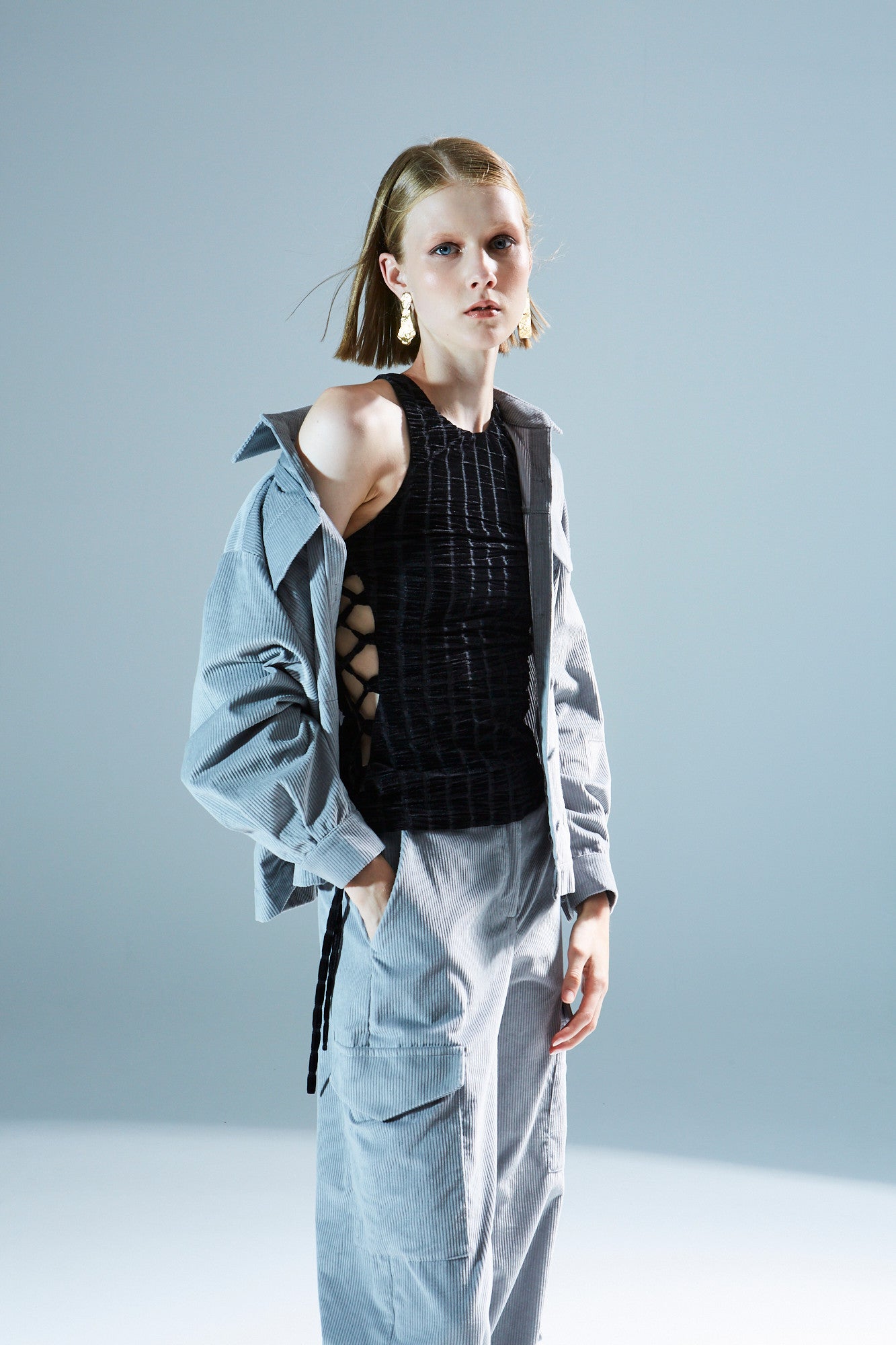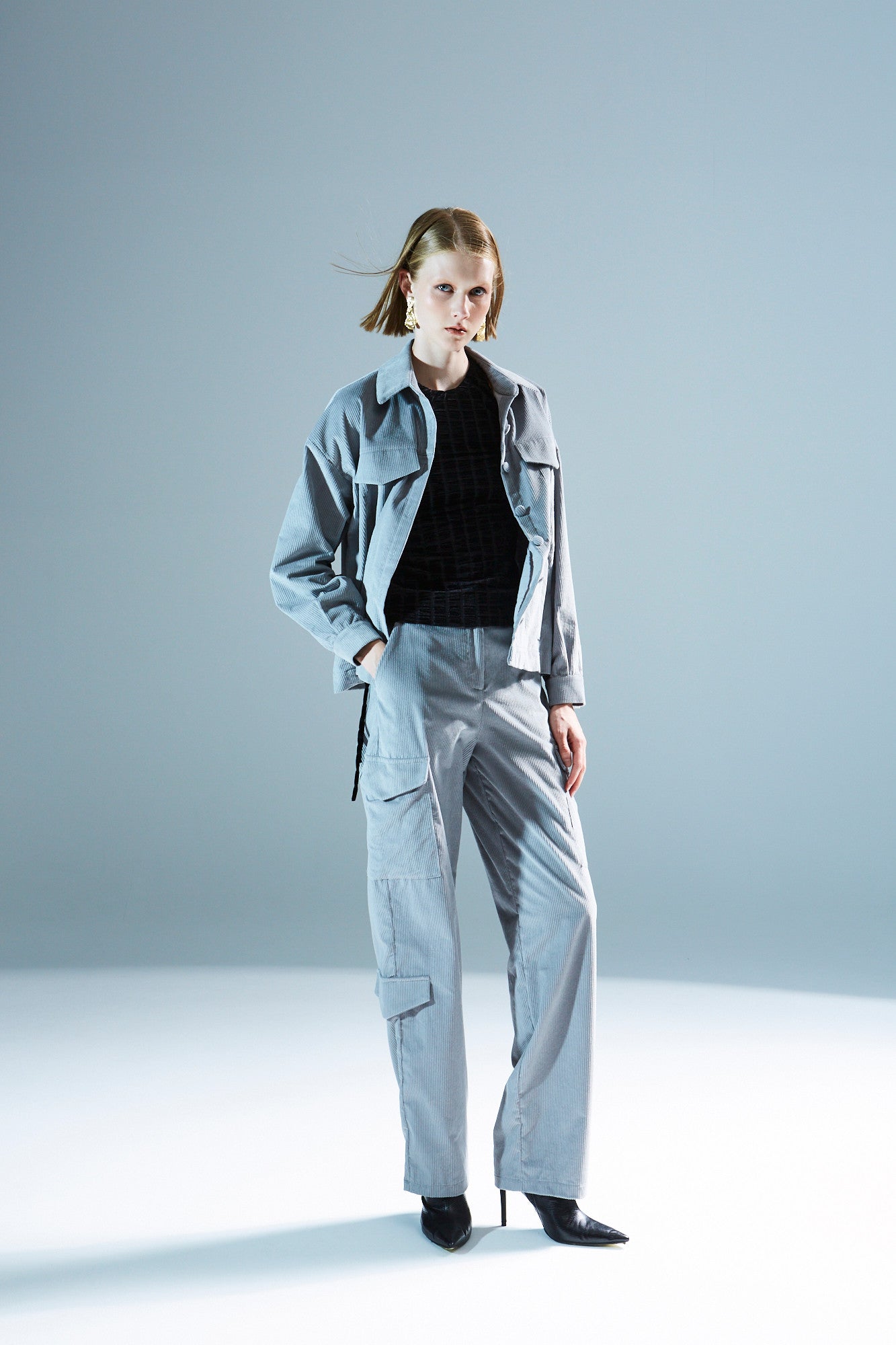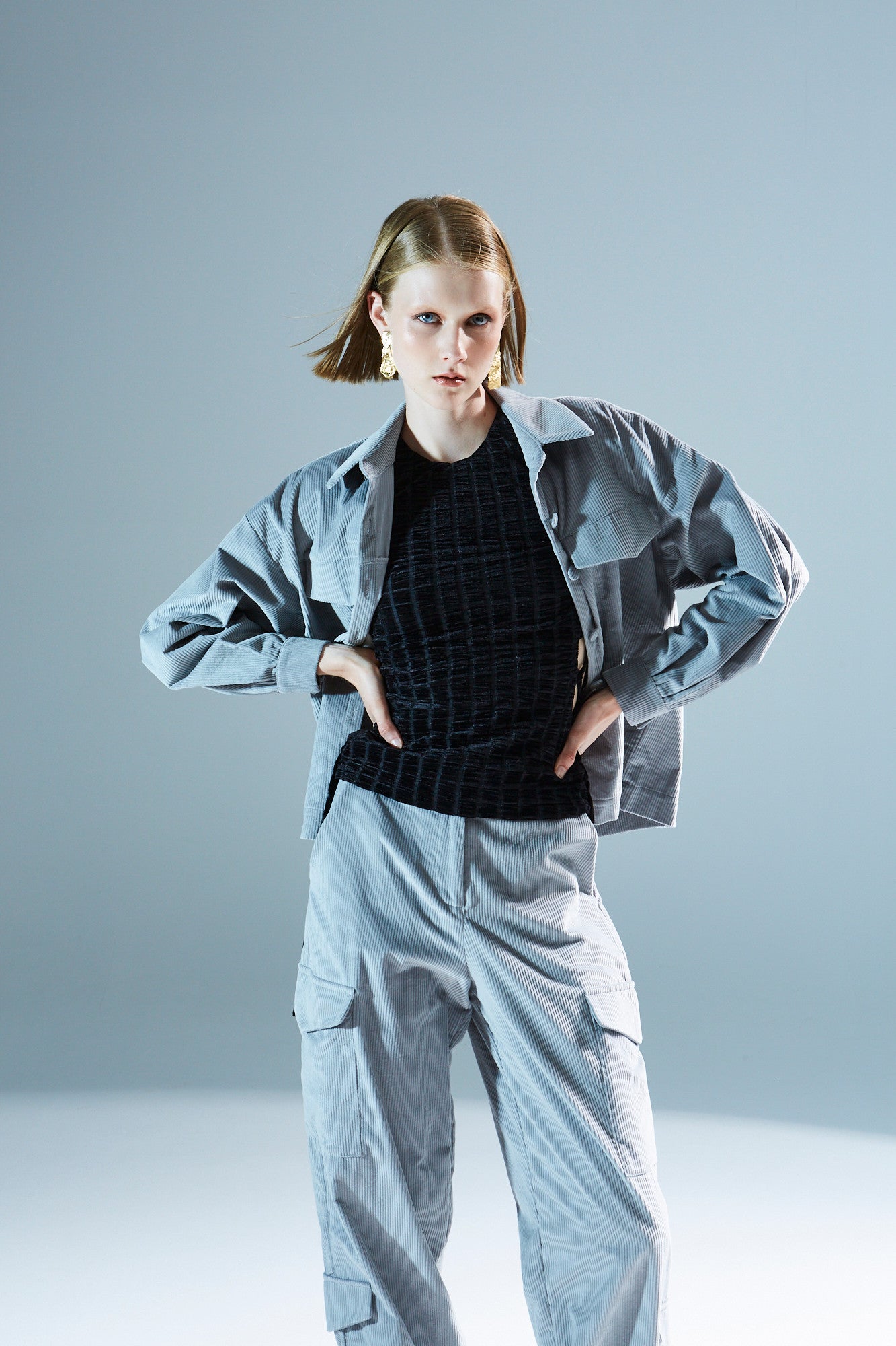 This contemporary utility – chic outfit features a light gray cropped jacket and wide – leg pants, both with a subtle pinstripe texture. The black inner layering adds a touch of contrast, creating a clean and sleek androgynous look.