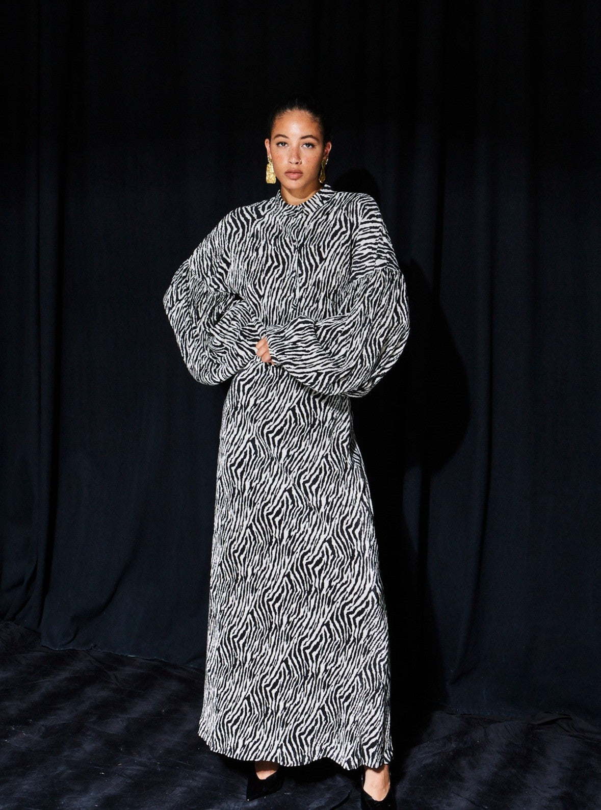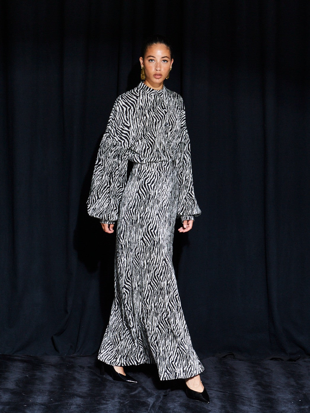 This formal maxi dress combines sophistication with an edgy touch. It features a striking black and white abstract animal – inspired print, reminiscent of a zebra pattern, on a matte, textured fabric. The high – neck turtleneck and balloon sleeves with gathered cuffs add an architectural and contemporary flair.